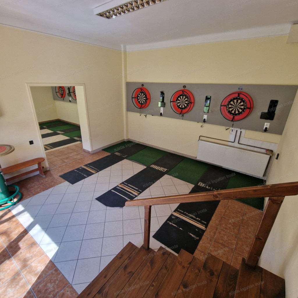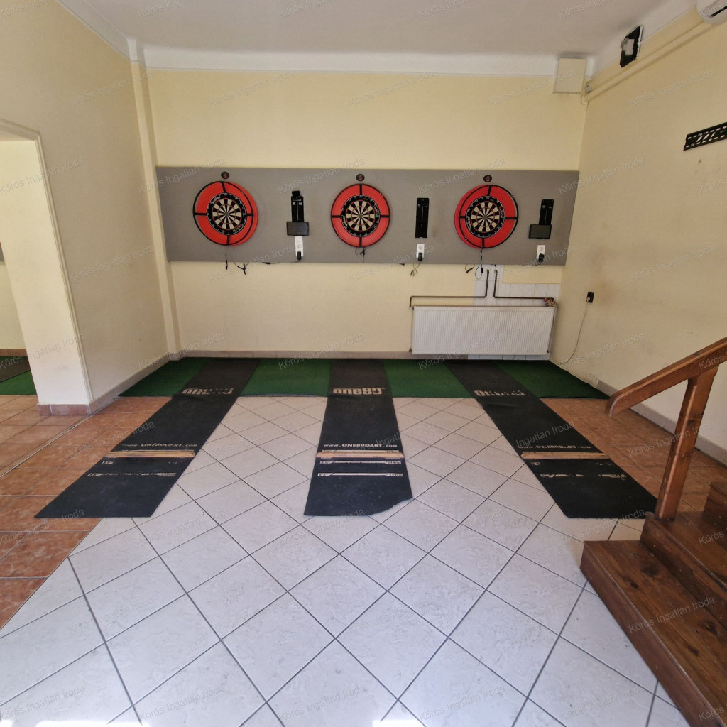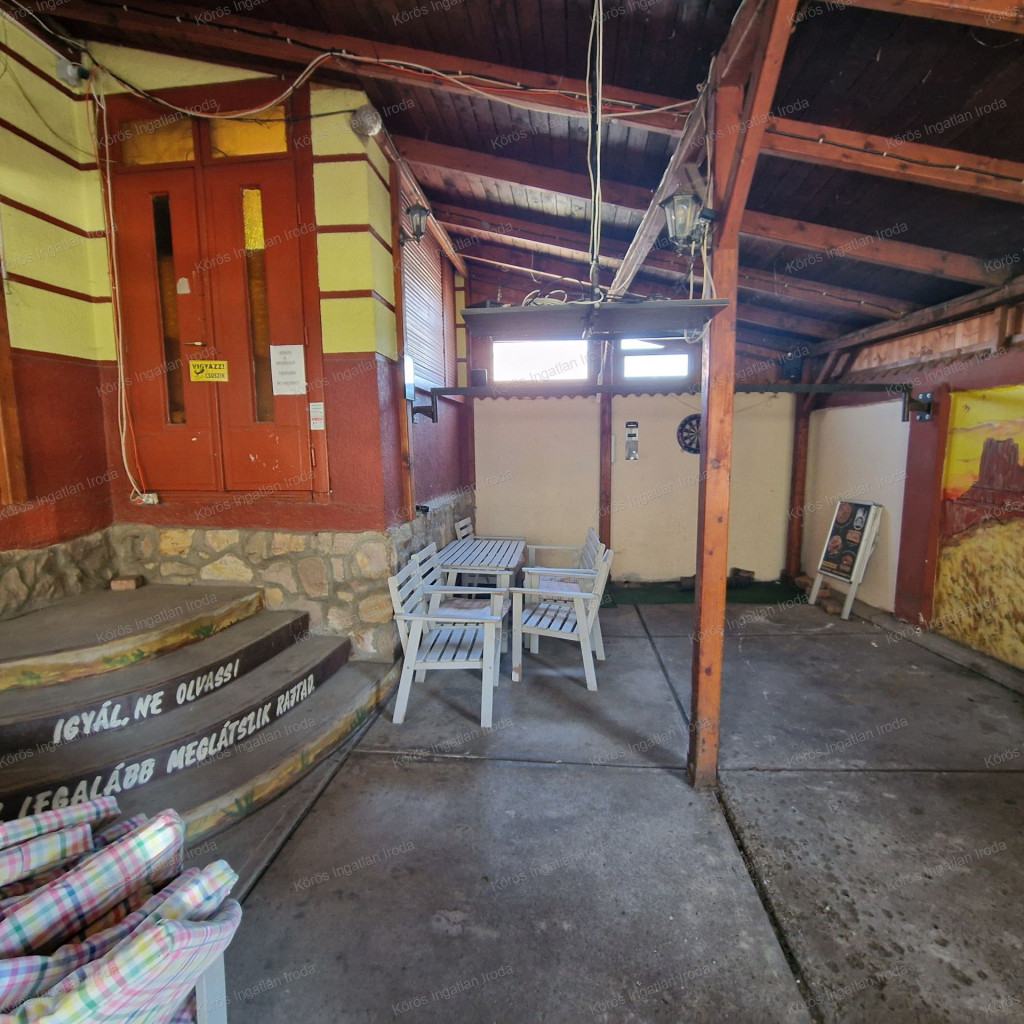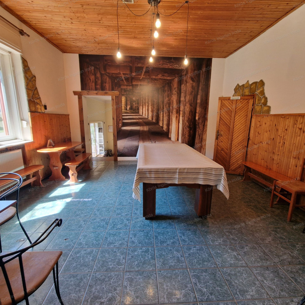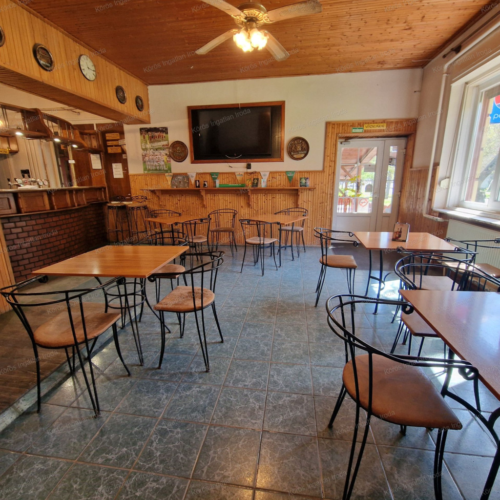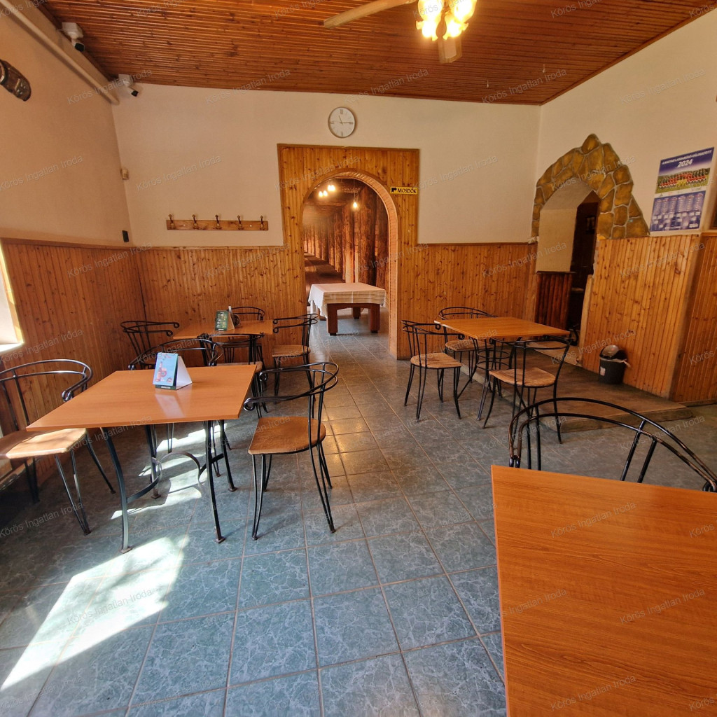 Évtizedes vendéglátó múltra visszatekintő ingatlan statikailag, esztétikailag kimondottan jó állapotú, összkomfortos, összközműves. Bejáratánál 72nm-es fedett terasz fogad, melynek fele téliesített. A vendégtér mellett biliárd szoba, és 2x3 pályás darts versenyekre kialakított helyiség található. A kiszolgáló pult mögött raktár, kazánház foglal helyet, és természetesen a férfi-női-személyzeti vizesblokk és az öltöző is rendelkezésre áll. Ennek az utcafronti elhelyezkedésű épületrésznek a hasznos négyzetmétere 150nm + a 72nm-es terasz. Kombi gázkazán, vegyes tüzelésű kazán, és klímák biztosítják a fűtést, a hűtést, és a melegvizet. Aljzata mindenhol hidegburkolattal ellátott, falazata festett, csempés, illetve lambériás.