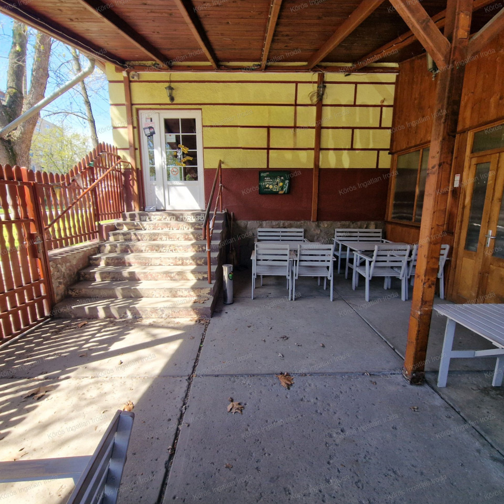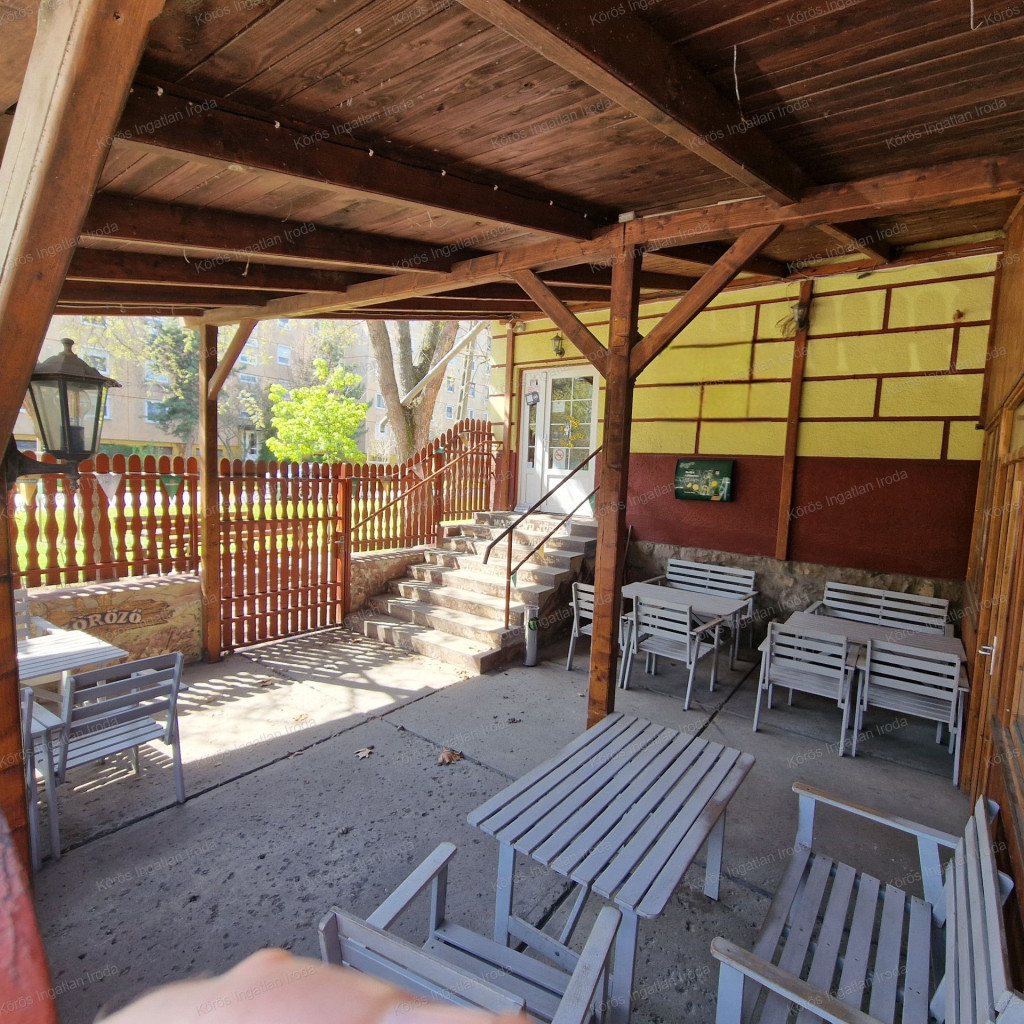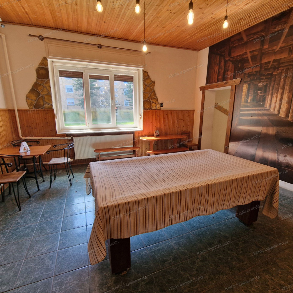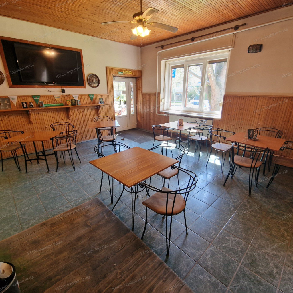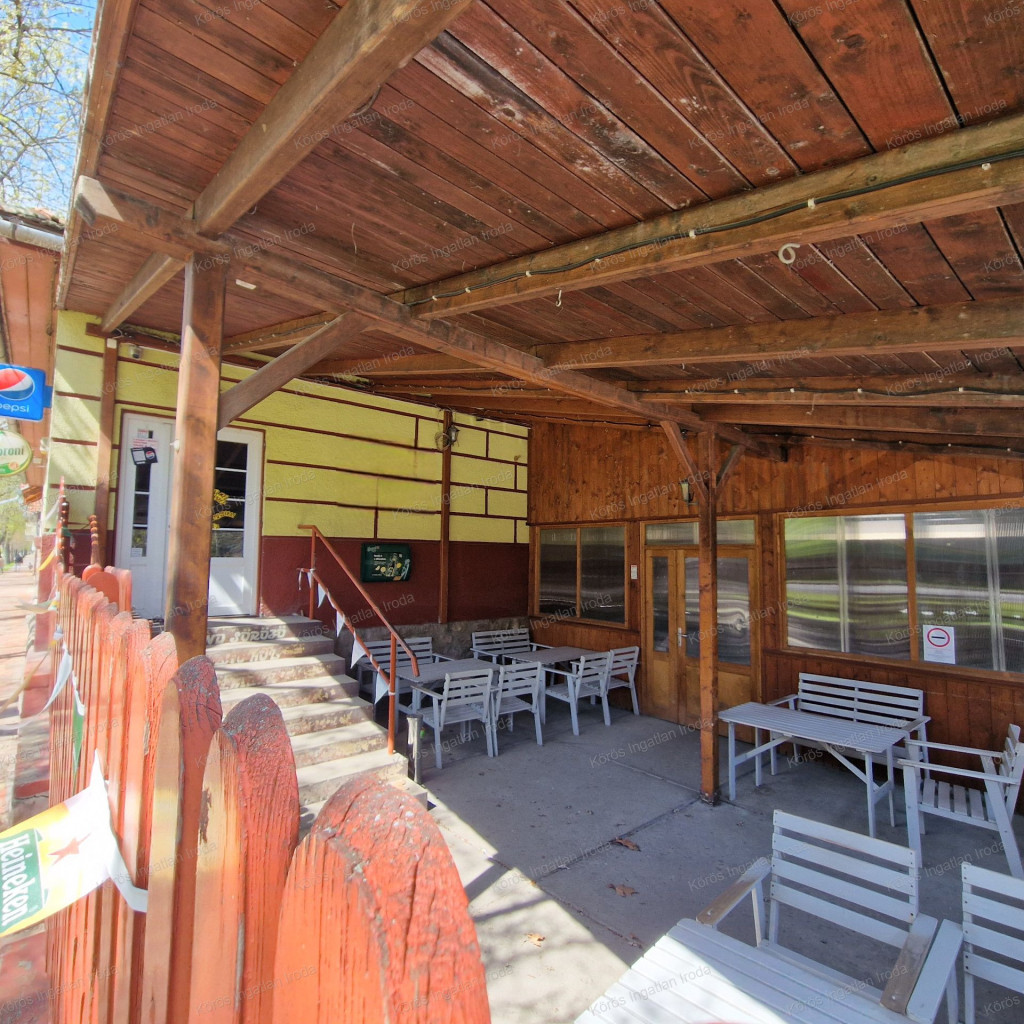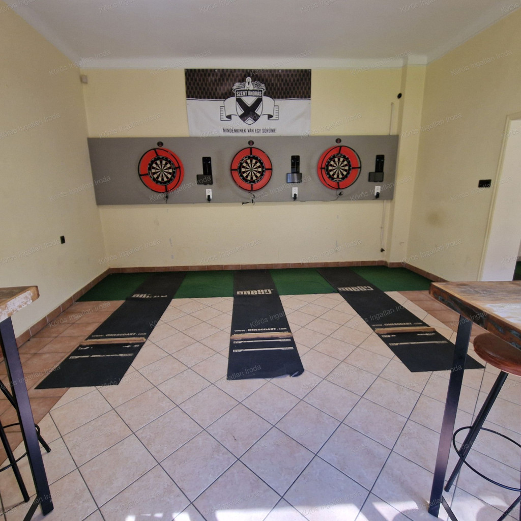 Évtizedes vendéglátó múltra visszatekintő ingatlan statikailag, esztétikailag kimondottan jó állapotú, összkomfortos, összközműves. Bejáratánál 72nm-es fedett terasz fogad, melynek fele téliesített. A vendégtér mellett biliárd szoba, és 2x3 pályás darts versenyekre kialakított helyiség található. A kiszolgáló pult mögött raktár, kazánház foglal helyet, és természetesen a férfi-női-személyzeti vizesblokk és az öltöző is rendelkezésre áll. Ennek az utcafronti elhelyezkedésű épületrésznek a hasznos négyzetmétere 150nm + a 72nm-es terasz. Kombi gázkazán, vegyes tüzelésű kazán, és klímák biztosítják a fűtést, a hűtést, és a melegvizet. Aljzata mindenhol hidegburkolattal ellátott, falazata festett, csempés, illetve lambériás.