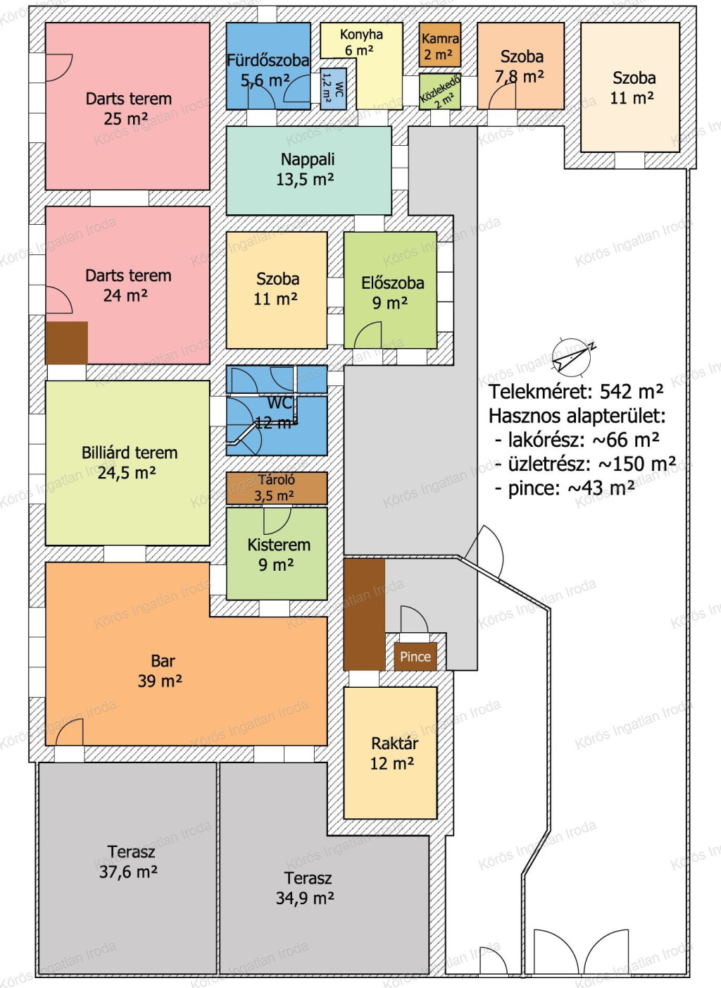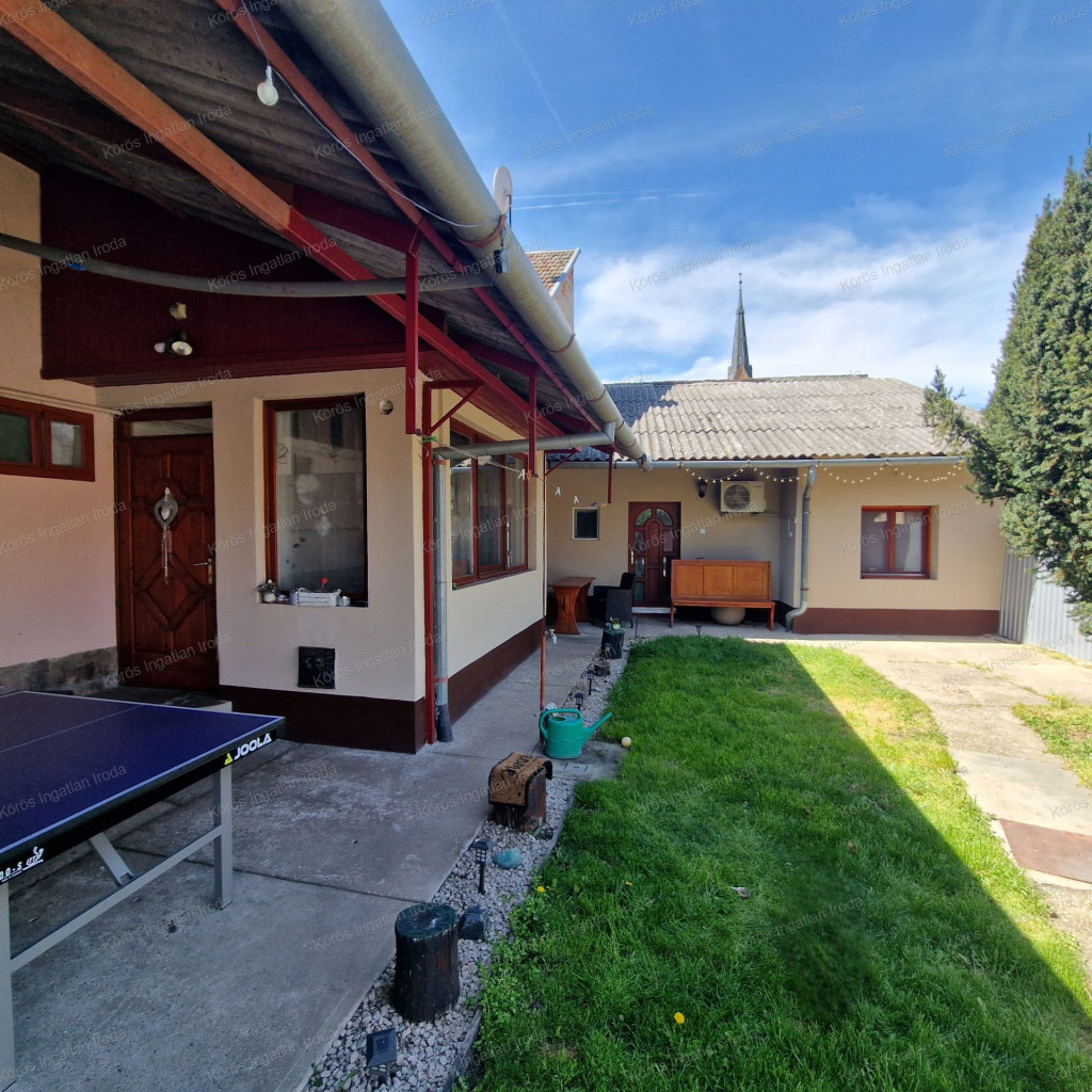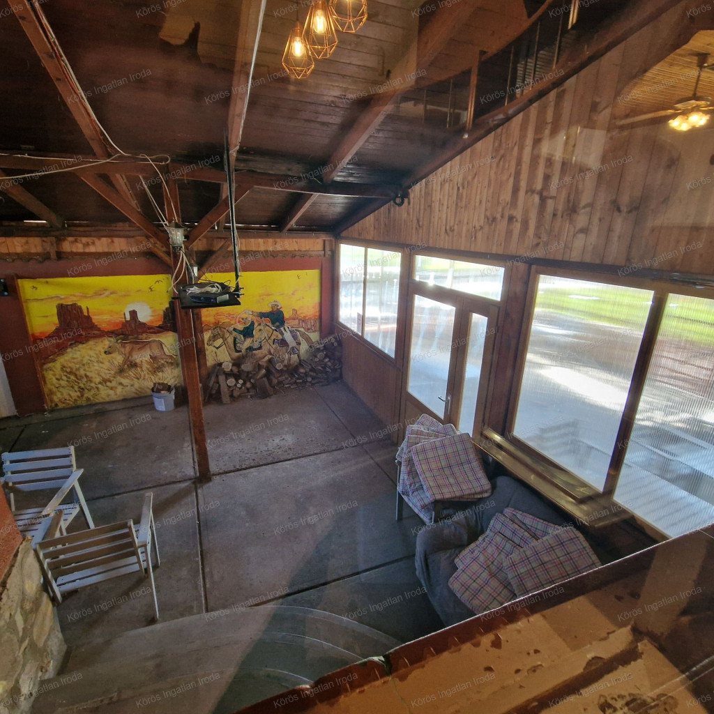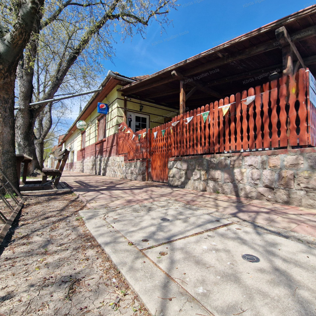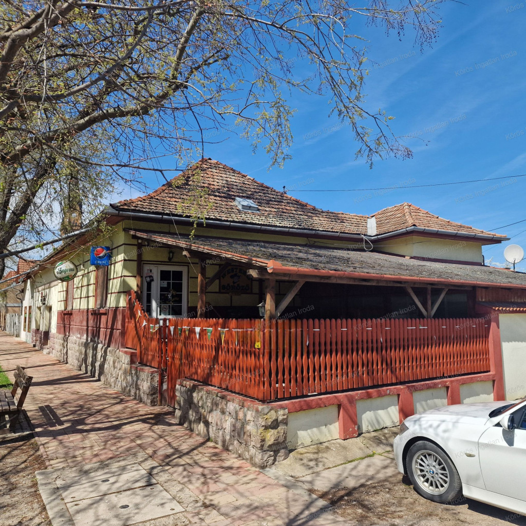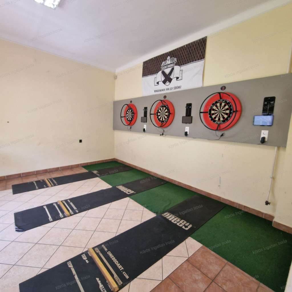 Évtizedes vendéglátó múltra visszatekintő ingatlan statikailag, esztétikailag kimondottan jó állapotú, összkomfortos, összközműves. Bejáratánál 72nm-es fedett terasz fogad, melynek fele téliesített. A vendégtér mellett biliárd szoba, és 2x3 pályás darts versenyekre kialakított helyiség található. A kiszolgáló pult mögött raktár, kazánház foglal helyet, és természetesen a férfi-női-személyzeti vizesblokk és az öltöző is rendelkezésre áll. Ennek az utcafronti elhelyezkedésű épületrésznek a hasznos négyzetmétere 150nm + a 72nm-es terasz. Kombi gázkazán, vegyes tüzelésű kazán, és klímák biztosítják a fűtést, a hűtést, és a melegvizet. Aljzata mindenhol hidegburkolattal ellátott, falazata festett, csempés, illetve lambériás.
