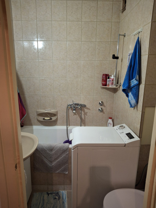 A fürdőszoba kádas a Wc egy térben. A mosógép kiállás a közlekedőben lévő garderob szekrényben lett kialakítva. Fűtése távfűtés havi kb 10 e meleg vízzel együtt.
