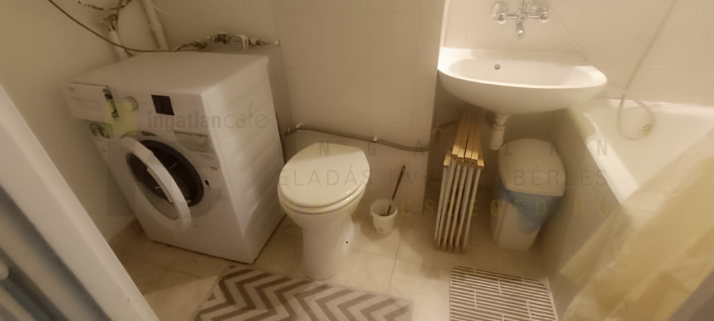 A konyha szeparált, a jó állapotú konyhabútor gépesített (kombi hűtő, mikró, gázfőzőlap, elektromos sütő). Mosógép van a fürdőszobában.