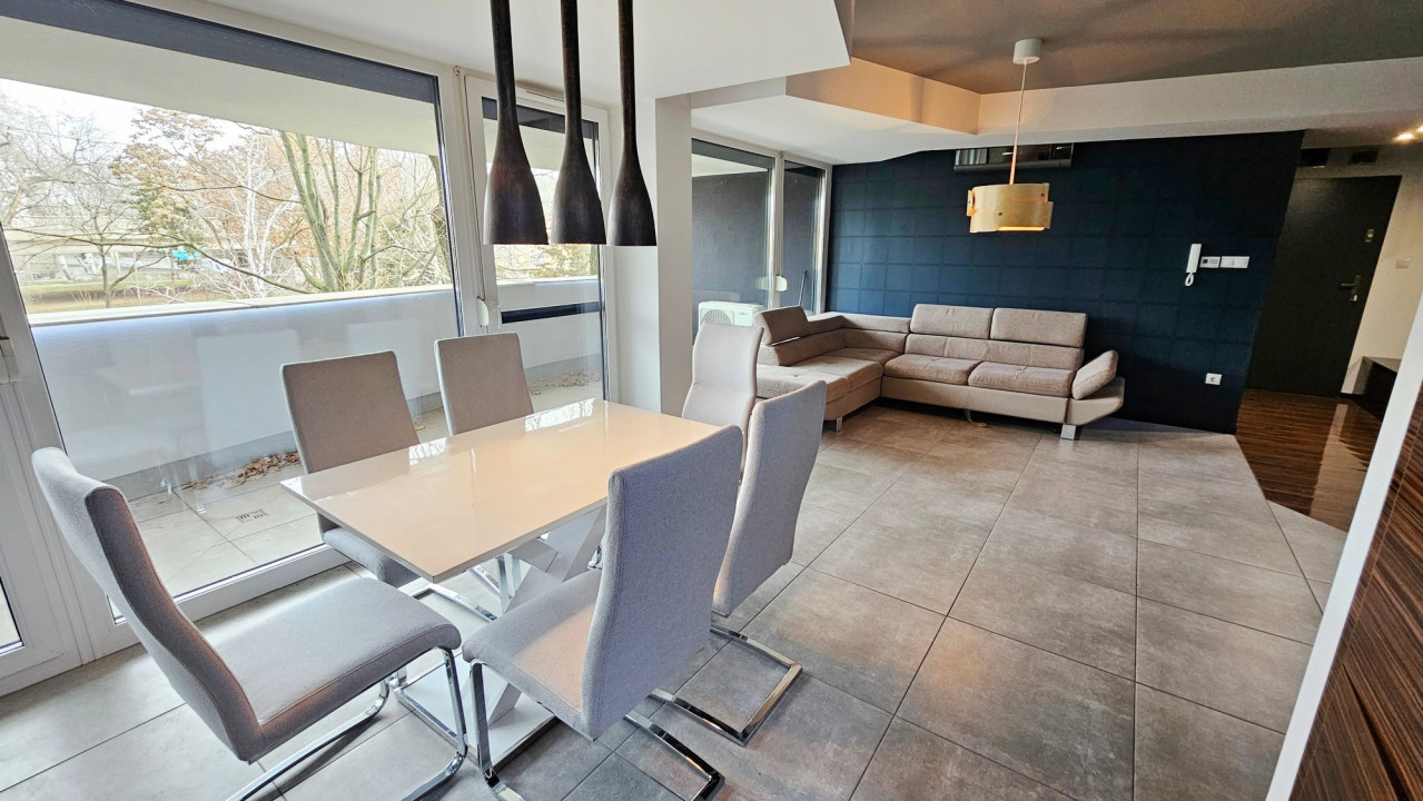 Szegeden, a Felső Tisza-parton, Török Csongor által tervezett, újszerű, LIFTES társasházban eladó egy ELSŐ EMELETI, nappali + 2 szobás, 2 erkélyes lakás.