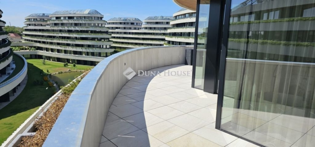 A lakás kilátása panorámás, a belső parkosított kertre, és a mesterségesen kialakított tóra néz.