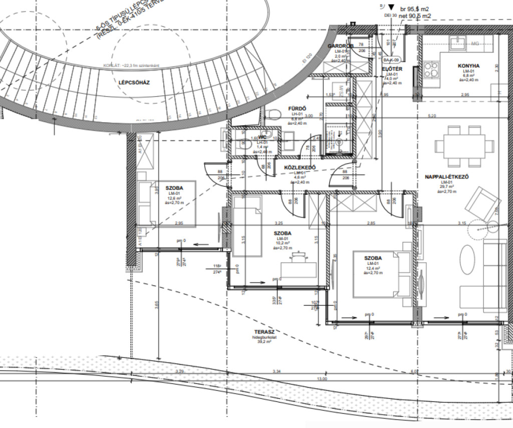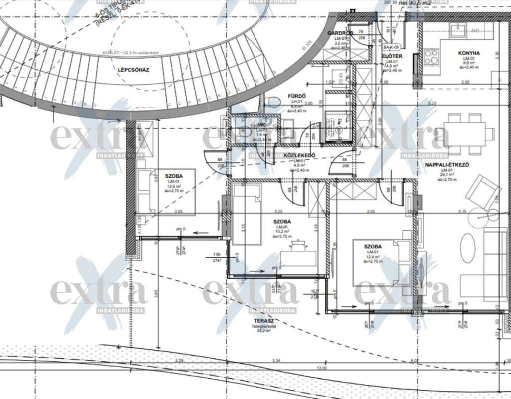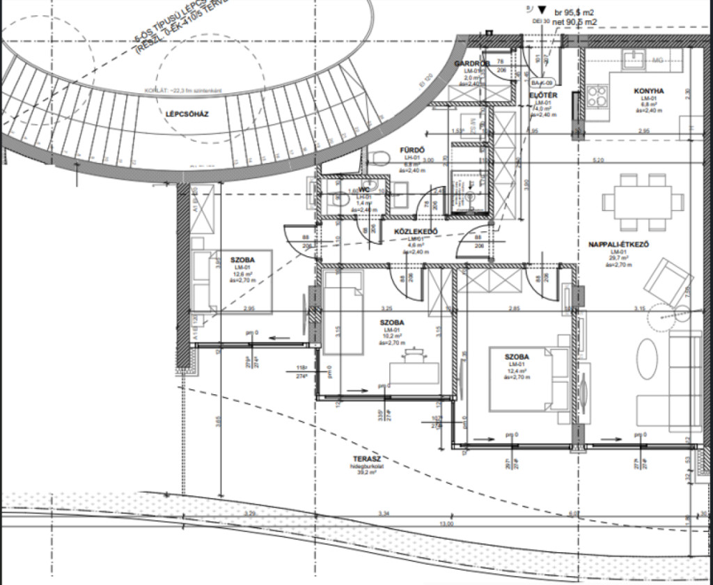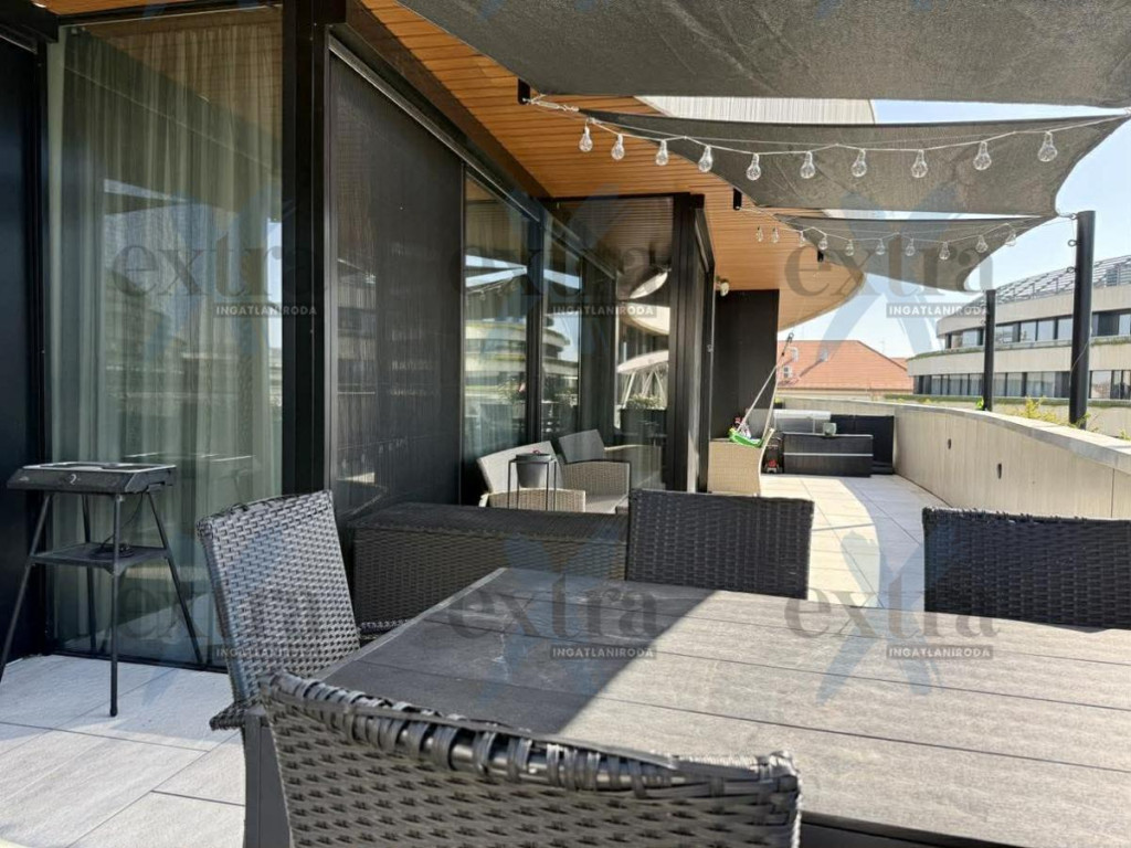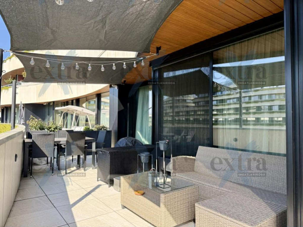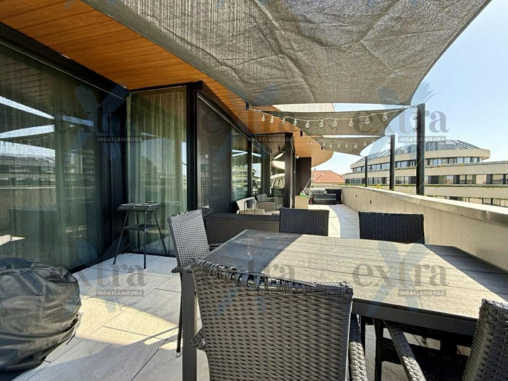 A hatalmas ablakokon keresztül klasszul beszűrődik a fény, a saját teraszunkra pedig tolóajtókon keresztül tudunk kijutni (terasz: 39 m2). A terasz egy része fedett, a többire napvitorlát raktak.