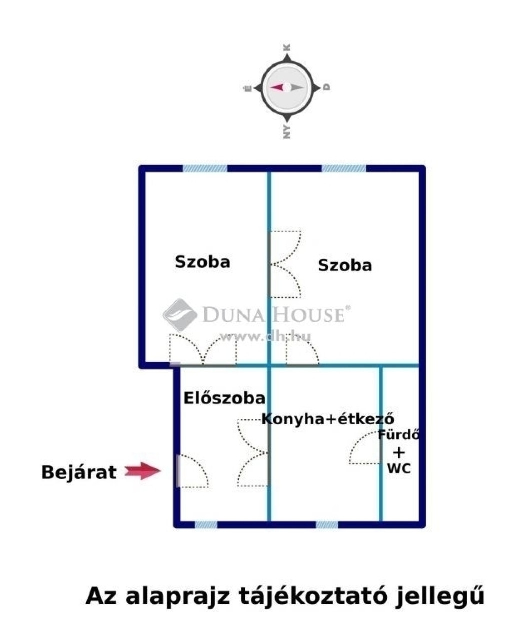 Elosztását tekintve a következő: két szoba, konyha+étkező, fürdőszoba+WC, előszoba.