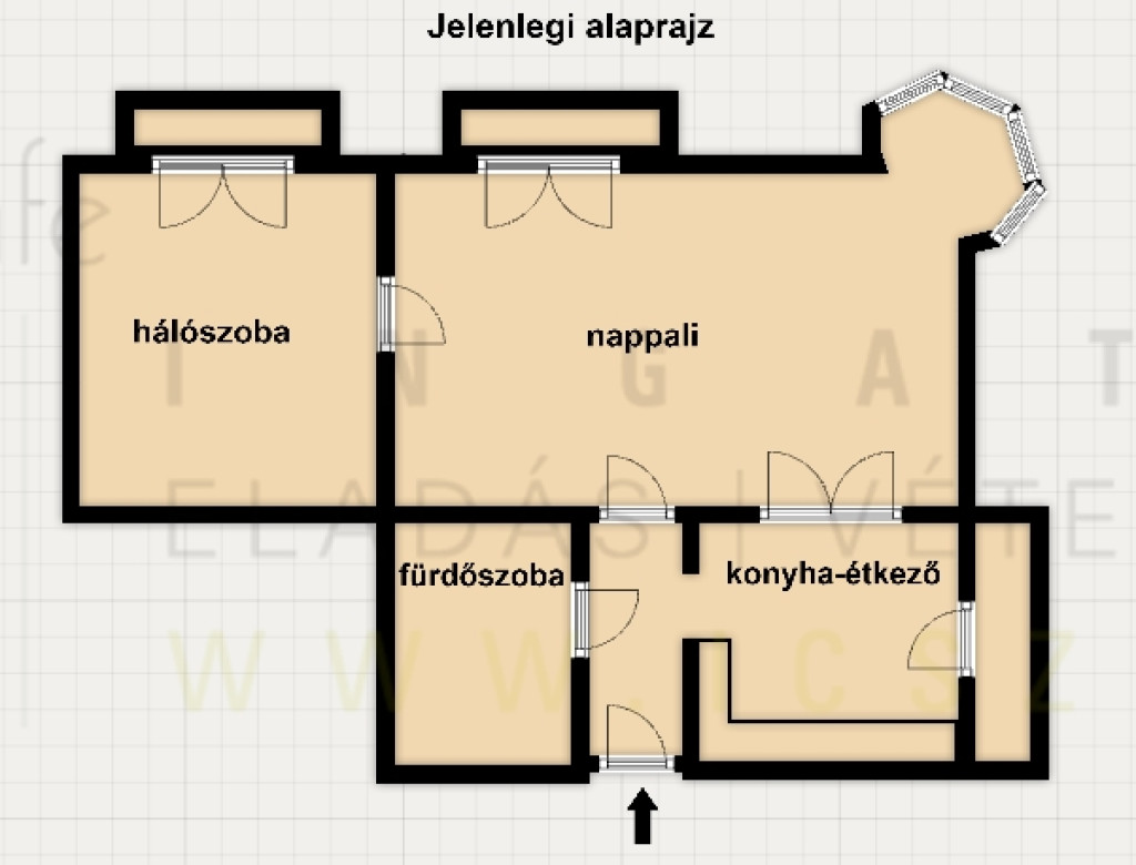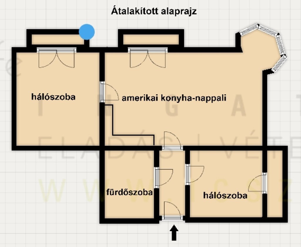 A lakás jelenleg két szobás, de igény esetén amerikai konyhás-nappali plusz két hálószobássá alakítható, ehhez az ötlethez is készítettem egy alaprajzot.