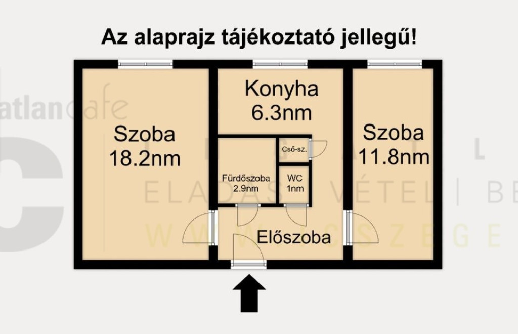 Két külön nyíló szoba, előszoba-folyosó, konyha, fürdőszoba és külön WC alkotja.
