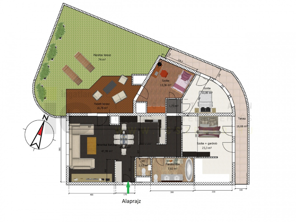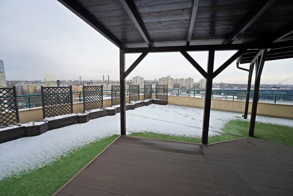A 95,5 nm-es körpanorámás, részben fedett terasz minden helyiségből megközelíthető, prémium holland pázsittal és WPC burkolattal.
