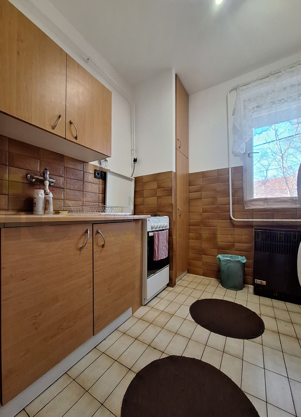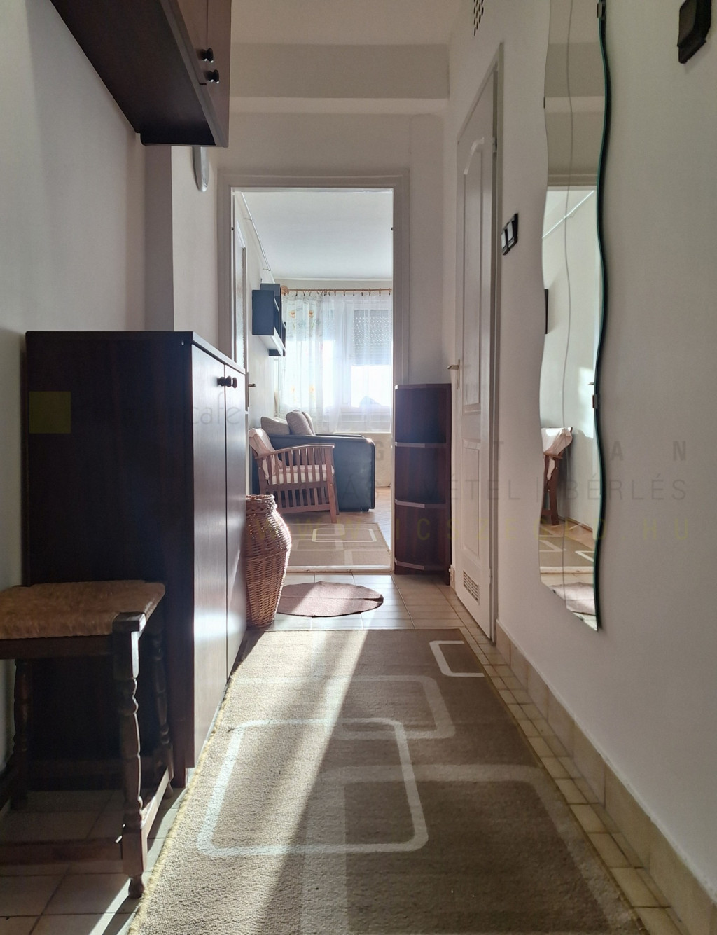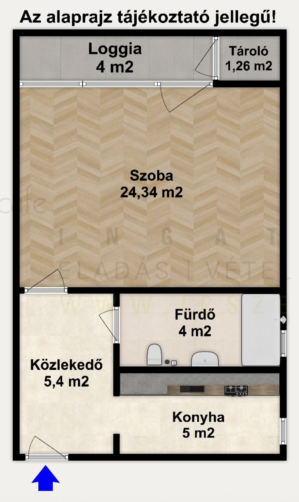 - a szobában faparketta van, a fürdő, konyha és a közlekedő járólappal burkolt