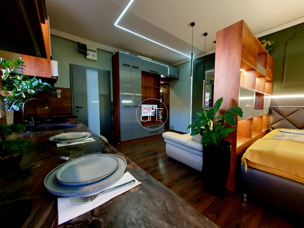 A stúdió egy légterű, egy ötletes polccal lett leválasztva a hálórész a nappalitól. A fürdőszoba tusolós, itt található a WC is.