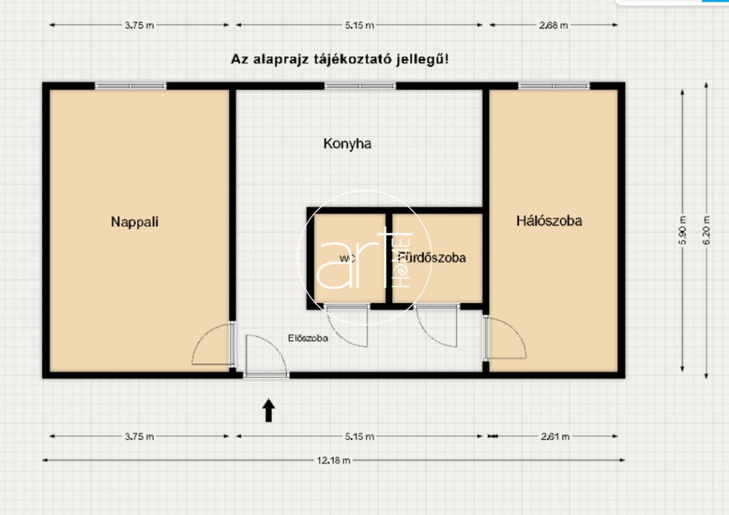 Az elrendezés a jól bevált panelos logika szerint működik: balra a nappali, szemben a konyha, jobbra a külön WC, a kádas fürdő és a hálószoba. A fűtés távhős, az ablakok már műanyagok, a ház viszont nem panelprogramos.