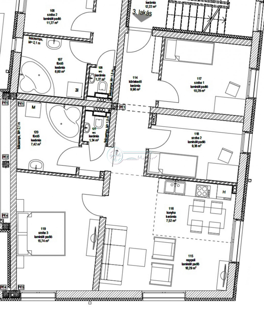 Ez a 3.számú, utcára néző lakás az 1. emeleten helyezkedik el. A 77,94 nm alapterületen az amerikai konyhás nappali mellett 3 hálószoba található.