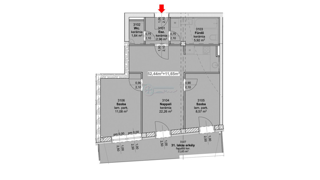 Ez a 31.jelű lakás a 3. emeleten helyezkedik el és 52,44 nm alapterülettel + 11,65 nm erkéllyel rendelkezik.