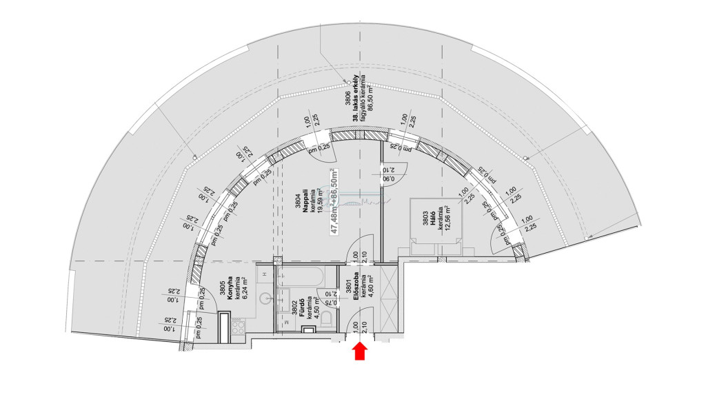 Ez a 38.jelű lakás a 4. emeleten helyezkedik el és 47,48 nm alapterülettel + 86,5 nm erkéllyel rendelkezik.