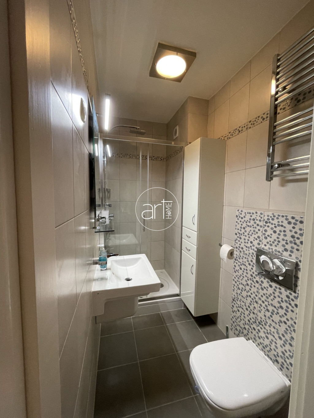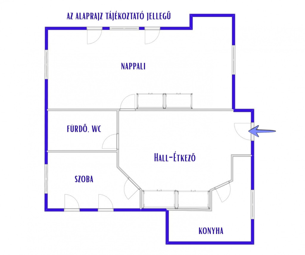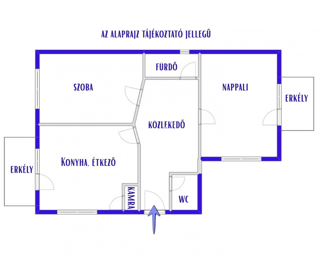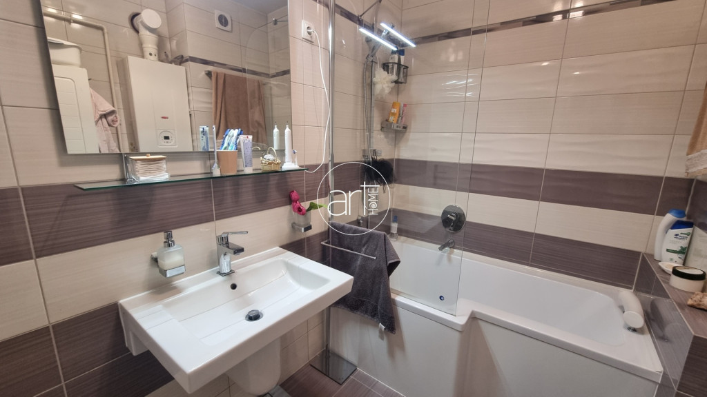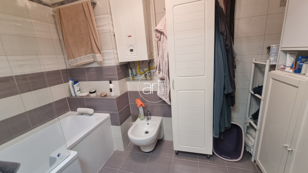 A fürdőszoba kádas, bidével, a wc pedig külön helyiségben kapott helyet. Az előtér/közlekedő kimondottan nagy méretű, innen érhetőek el a helyiségek.