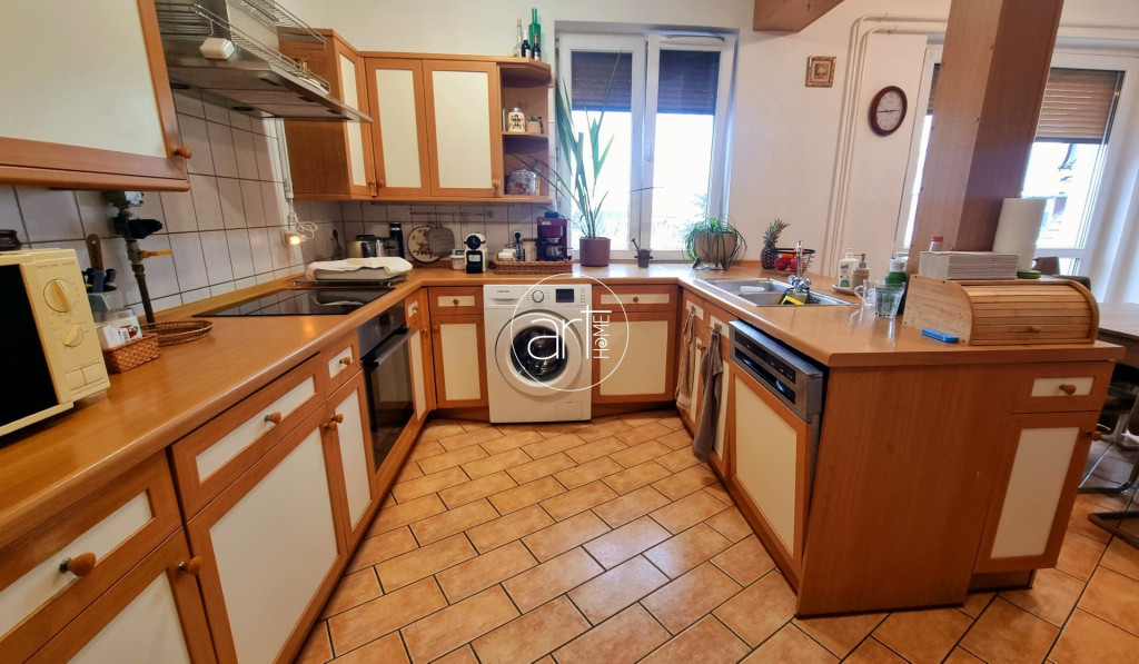 A konyha beépített mosogatógéppel, mosógéppel, elektromos sütővel és indukciós főzőlappal felszerelt. Emellett kimondottan sok pakolófelület van, és az ötletesen kialakított konyhasziget még bortartót is rejt.