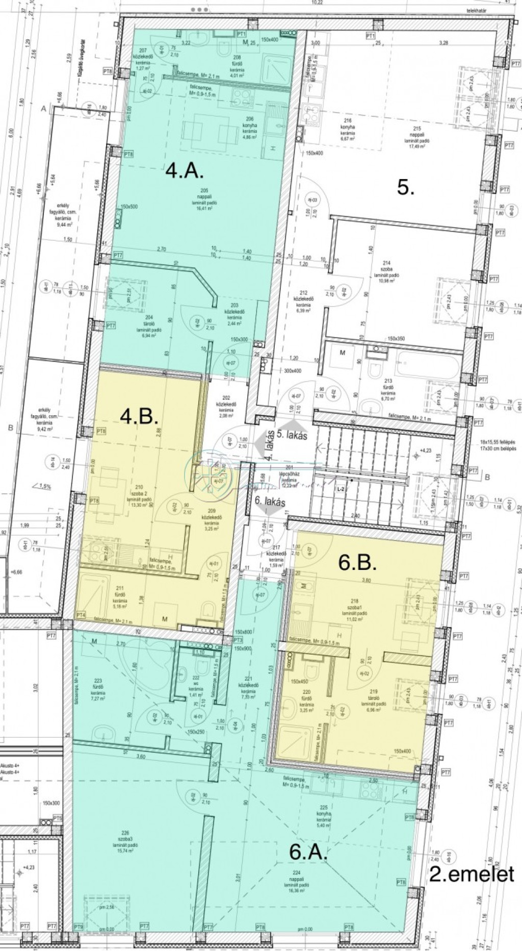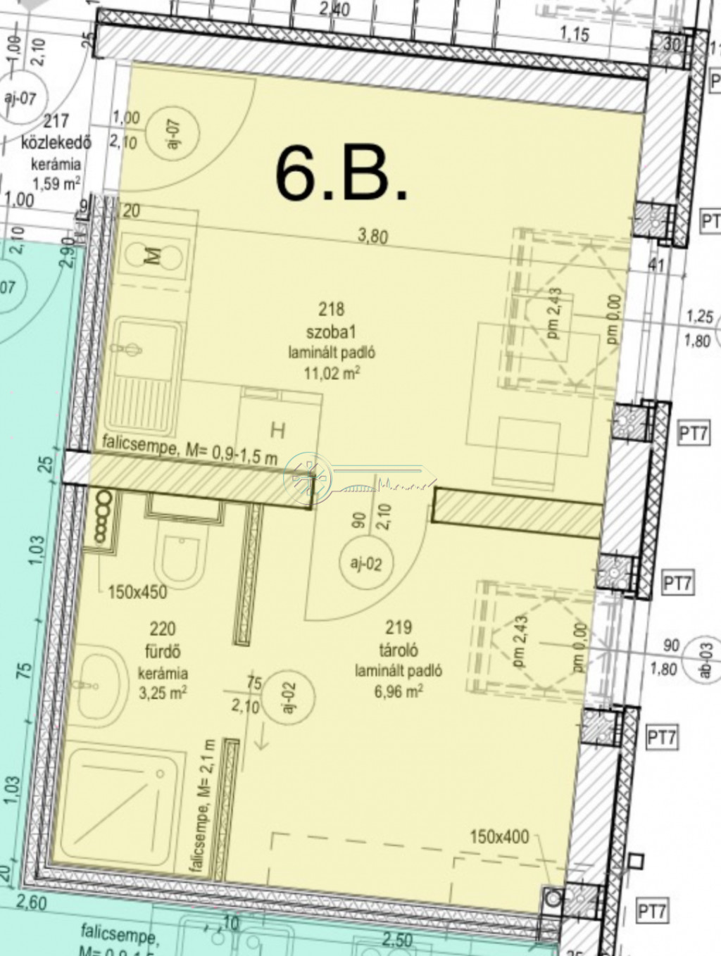 Ez a 6/B.számú, utcára néző lakás a 2. emeleten helyezkedik el. A 21,23 nm alapterületen az amerikai konyhás nappali mellett 1 hálószoba található. A lakás az 1,59 nm alapterületű közös előtérből közelíthető meg. (A képen sárgával van jelölve.)