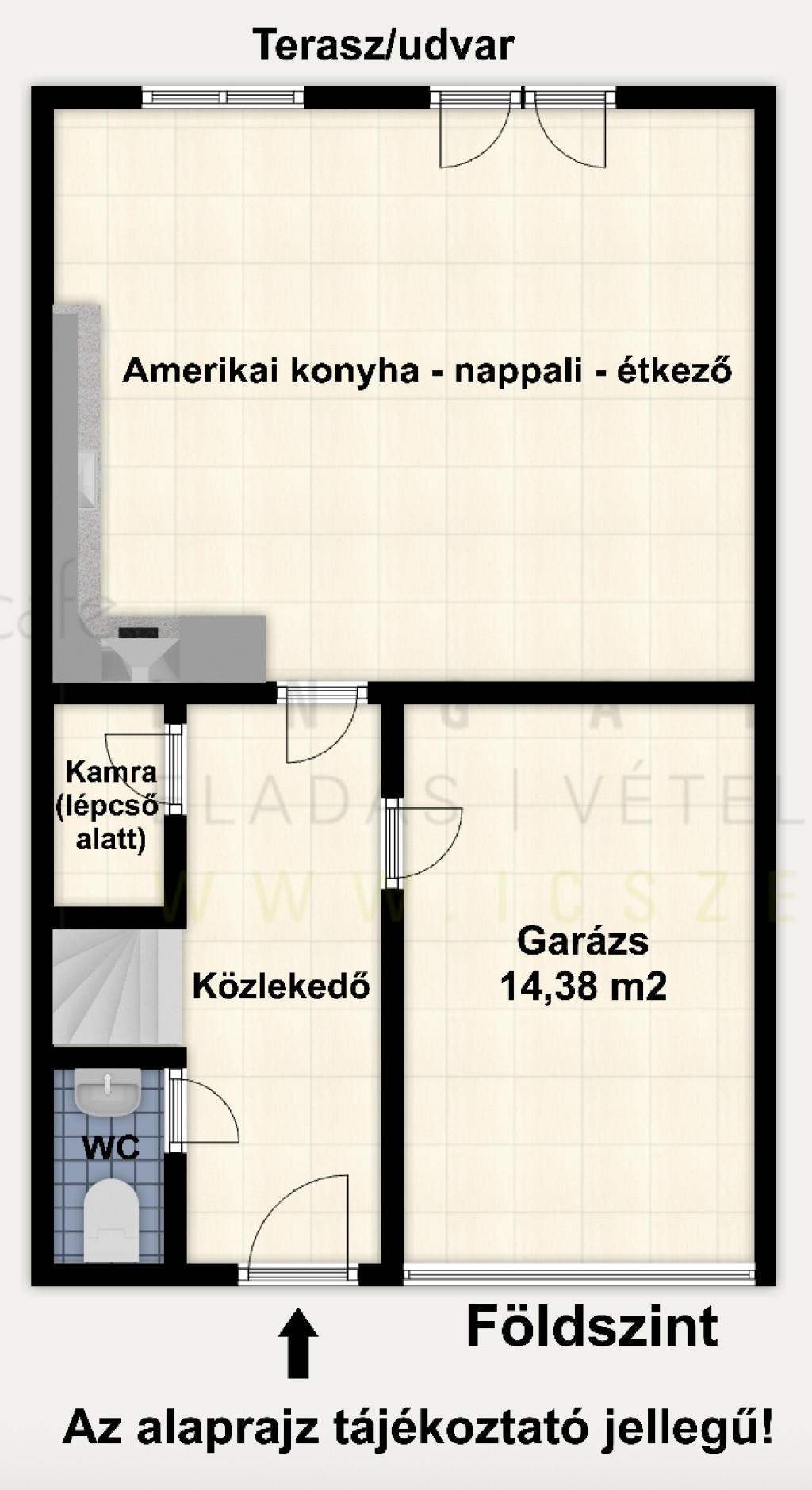 - garázs (14,38 m2) elektromos kapuval, ami közvetlenül a lakásból is megközelíthető