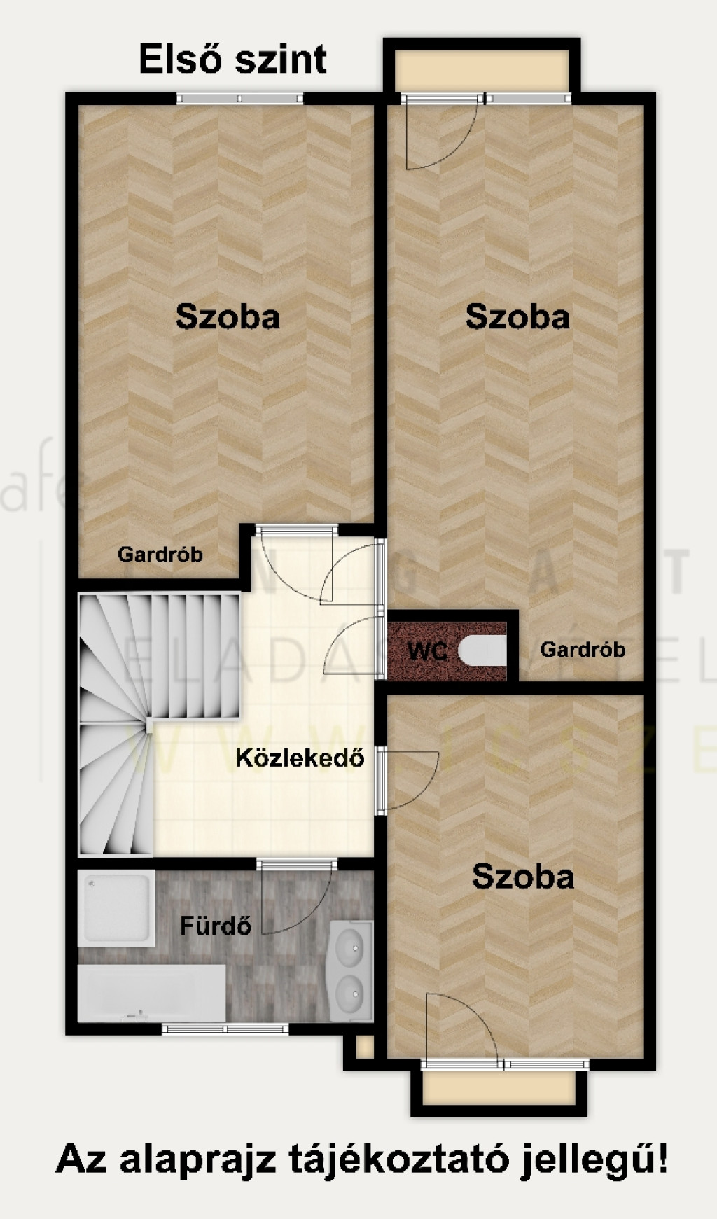 - 3 egész szoba (15,49 m2, 14,92 m2, 12,69 m2): a szobák külön nyílnak, kettőhöz gardrób és francia erkély is tartozik, a harmadikban pedig nagy beépített szekrény található