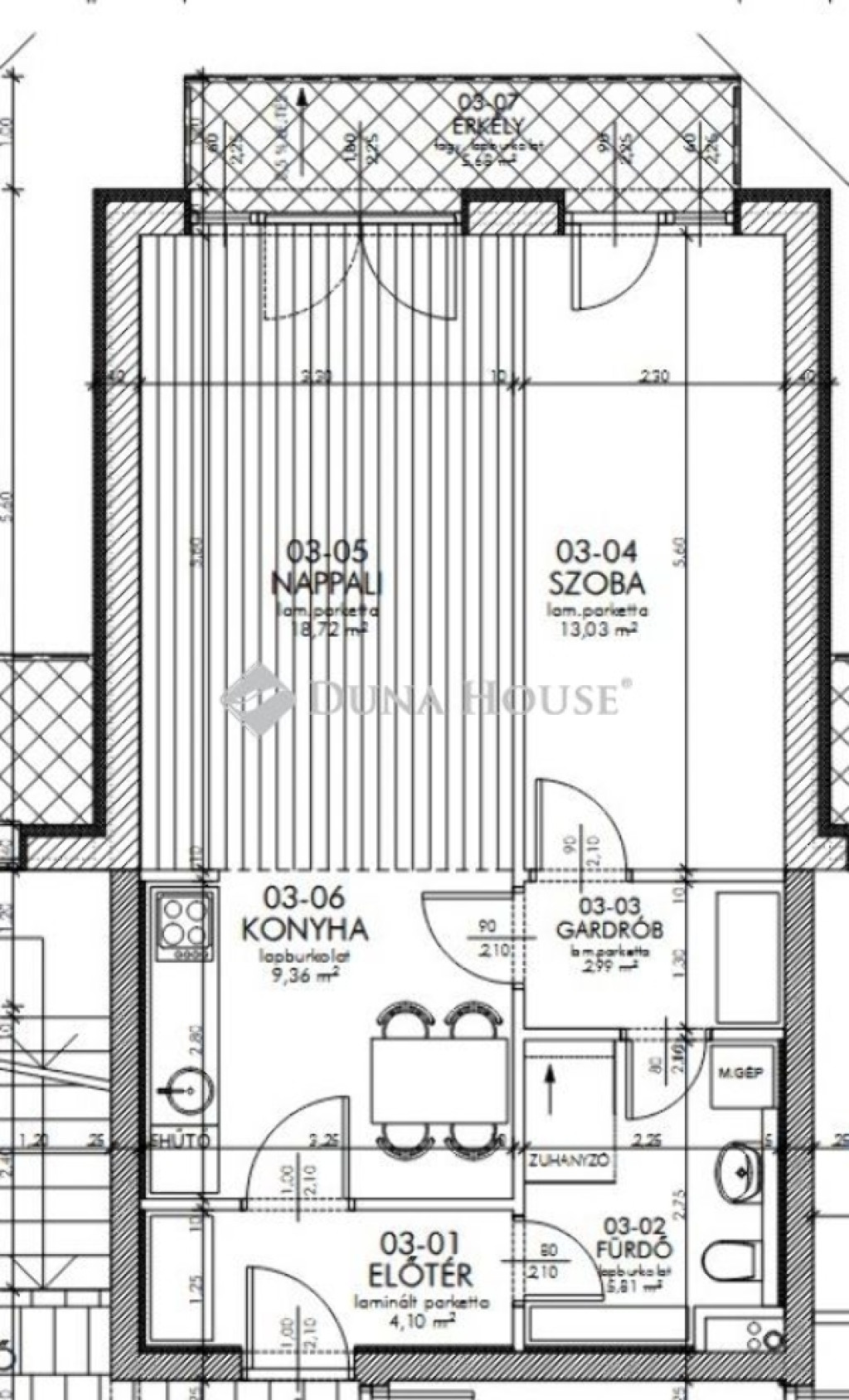Helyiségei: - nappali+konyha, - szoba, - gardrób, - fürdő+WC, - előtér, - erkély