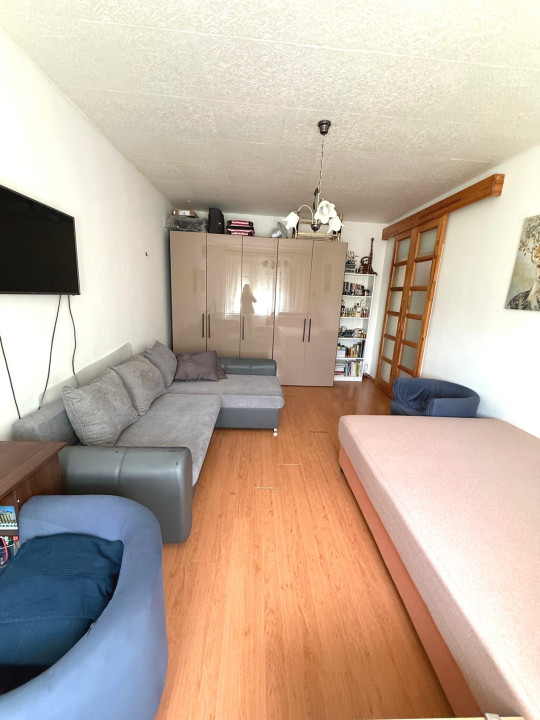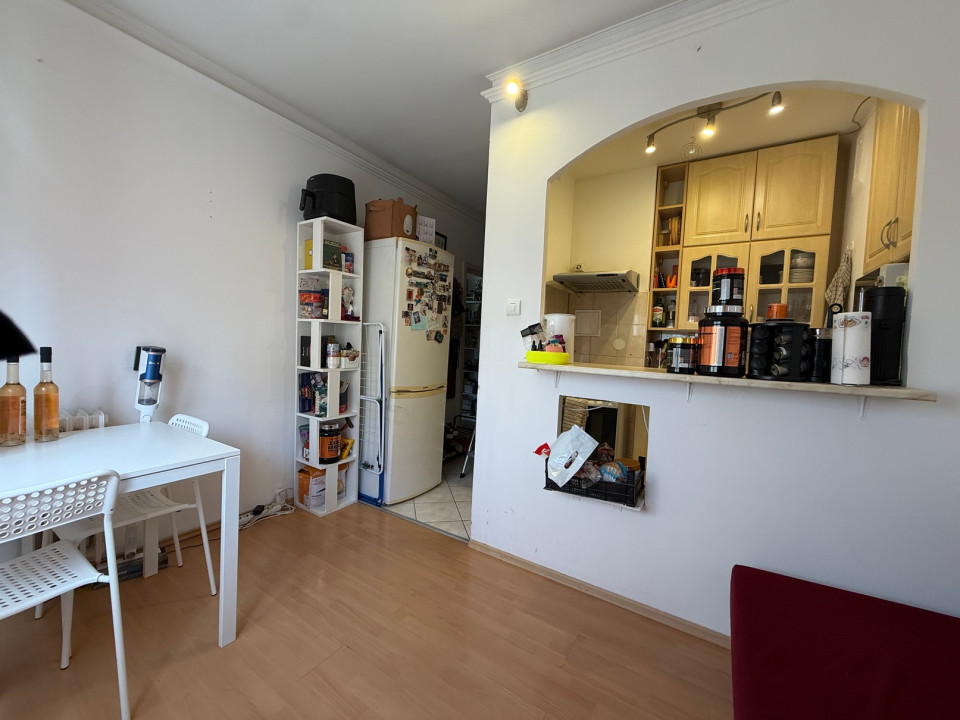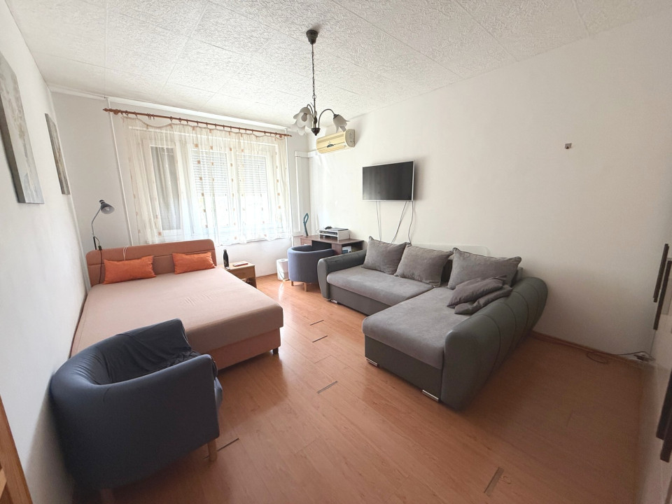 A lakás elosztása: 1 nagy szoba, fürdőkádas fürdőszoba egy helyiségben a toalettel, főzőfülke – átadóablakkal megnyitva a fél szoba, így ez étkezőként funkcionál jelenleg, de igény szerint visszaalakítható hálószobává. A nagyobb szoba klímával felszerelt.