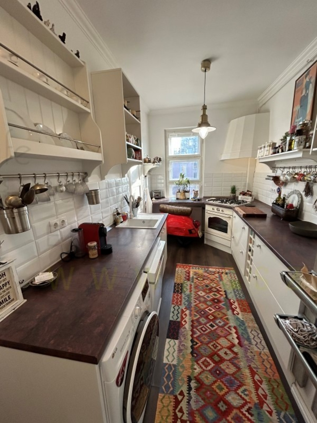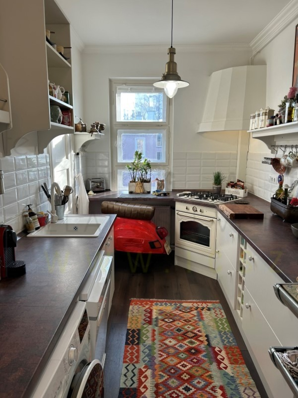 - igényes konyhabútor gépesítve (kürtős szagelszívó, beépített villanysütő gáz főzőlappal, mosogatógép, mosó-és szárítógép)