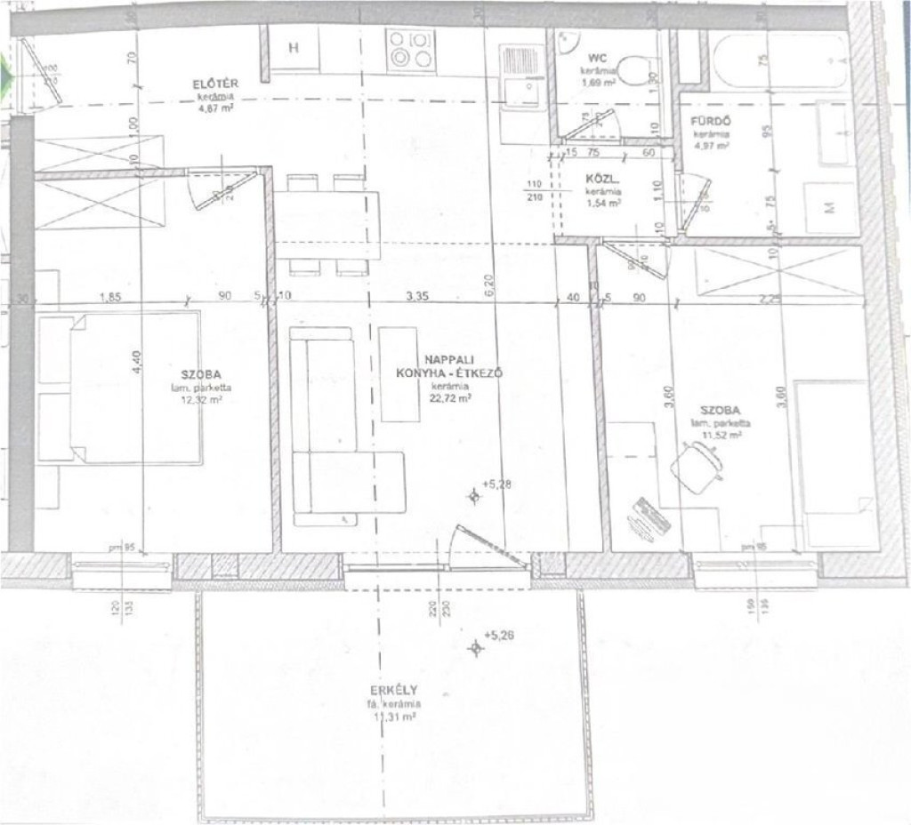 A 66,5 nm-es alapterület 60 nm lakóteret és egy 11,3 nm-es teraszt foglal magában. A lakás elosztása praktikus: amerikai konyhás nappali, két különnyíló hálószoba, előszoba, tágas fürdő és egy különálló WC található.
