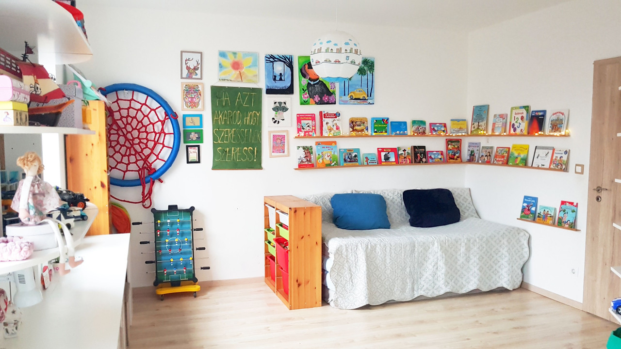 A jelenlegi 23 m²-es gyerekszoba kis átalakítással – a gardrób megszüntetésével – két külön bejáratú szobává alakítható, így akár nagyobb család számára is ideális választás lehet. Itt valóban mindenkinek lehet saját szobája.