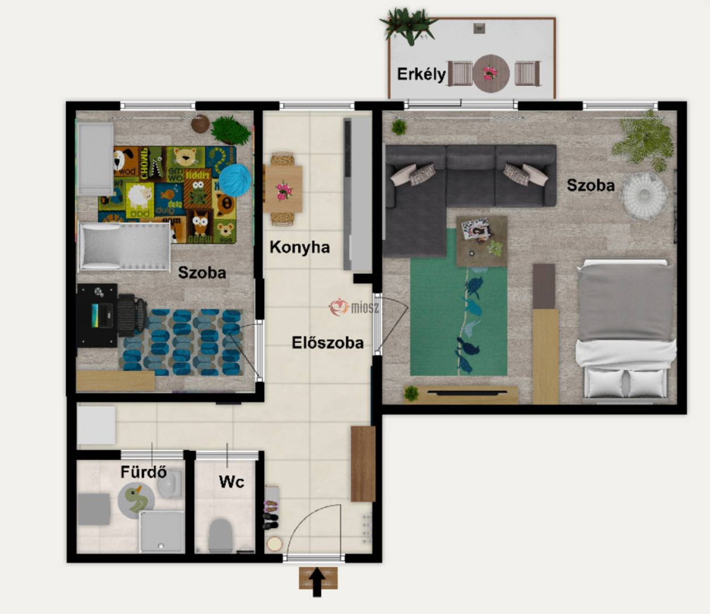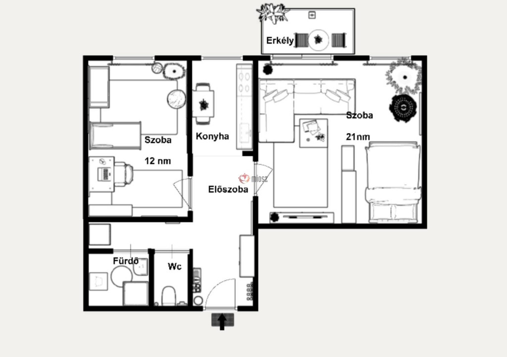Elrendezés: nagy szoba erkéllyel + külön hálószoba