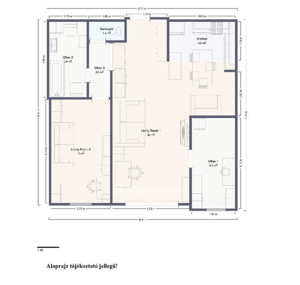A praktikus elrendezés kényelmes életteret biztosít: két külön nyíló hálószoba, valamint egy tágas, 32 m²-es nappali–konyha–étkező szolgálja a mindennapok nyugalmát. A fürdőszoba mellett külön WC is kialakításra került, a beépített szekrények pedig diszkrét, mégis bőséges tárolási lehetőséget nyújtanak.