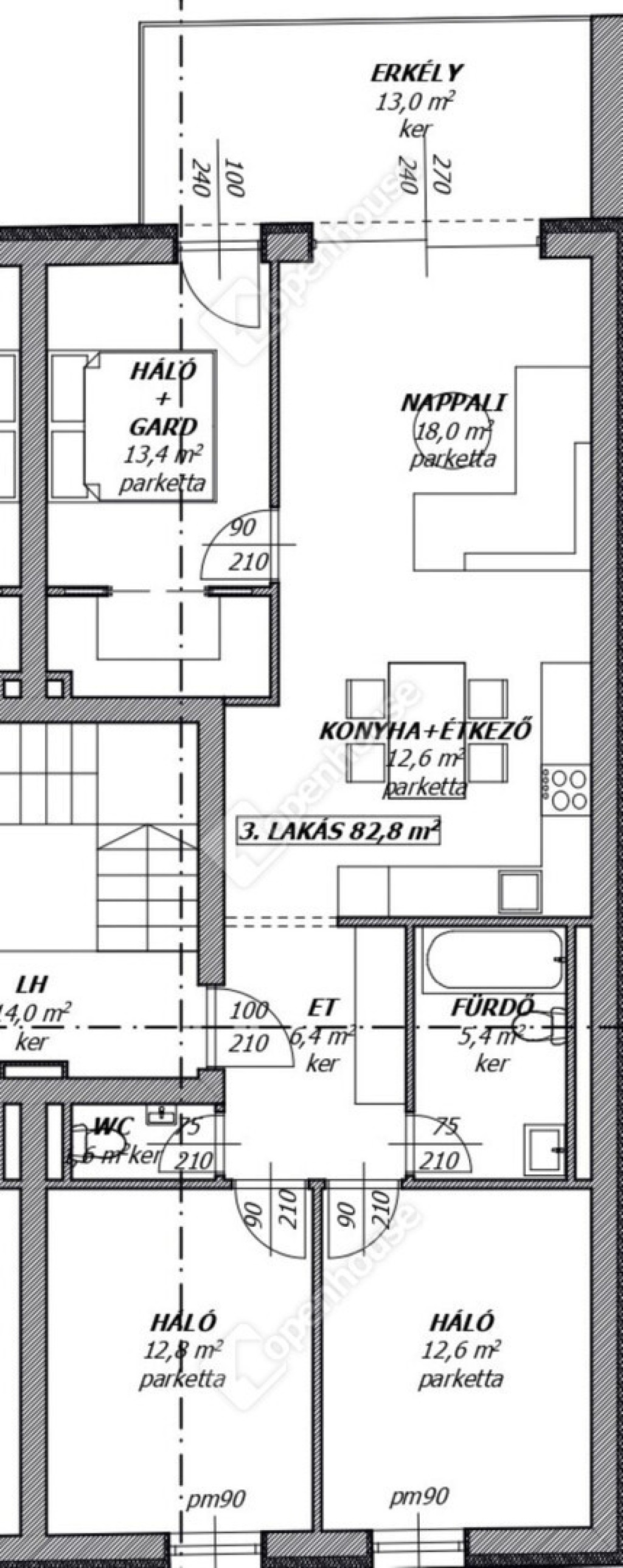 három különálló hálószoba, köztük gardróbos szülői háló