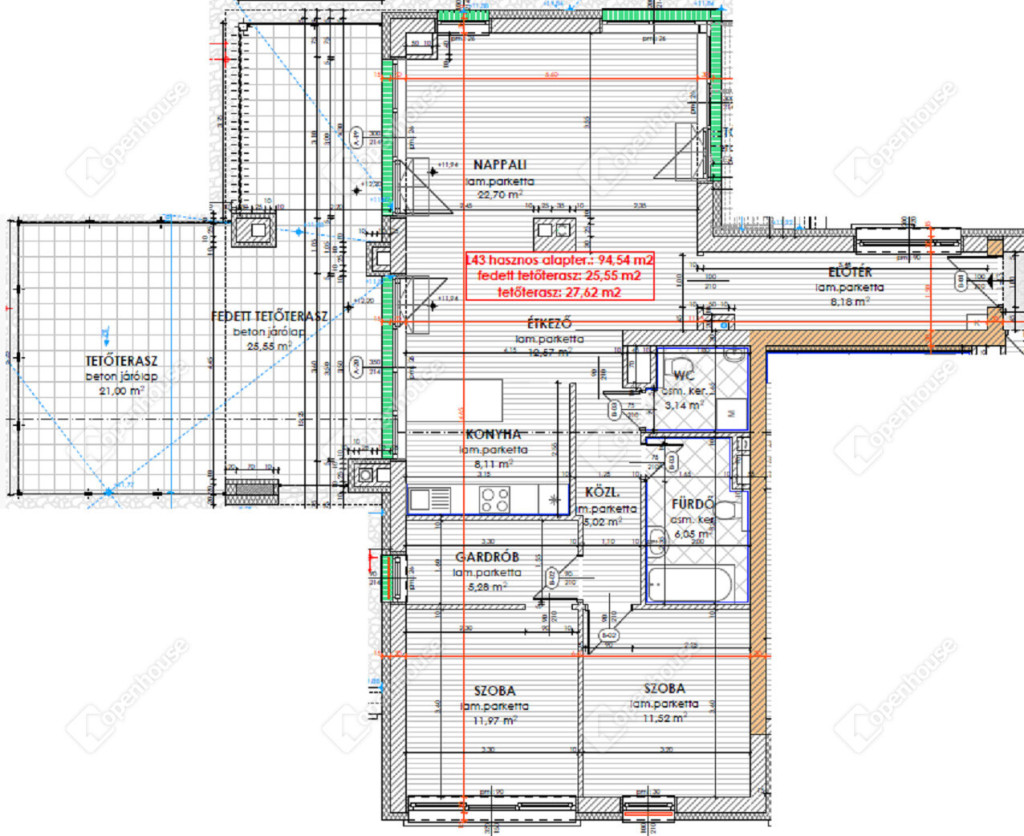 nettó 94,54 m2-es lakás + 25,55 m2-es fedett terasz, 21 m2 tetőterasz