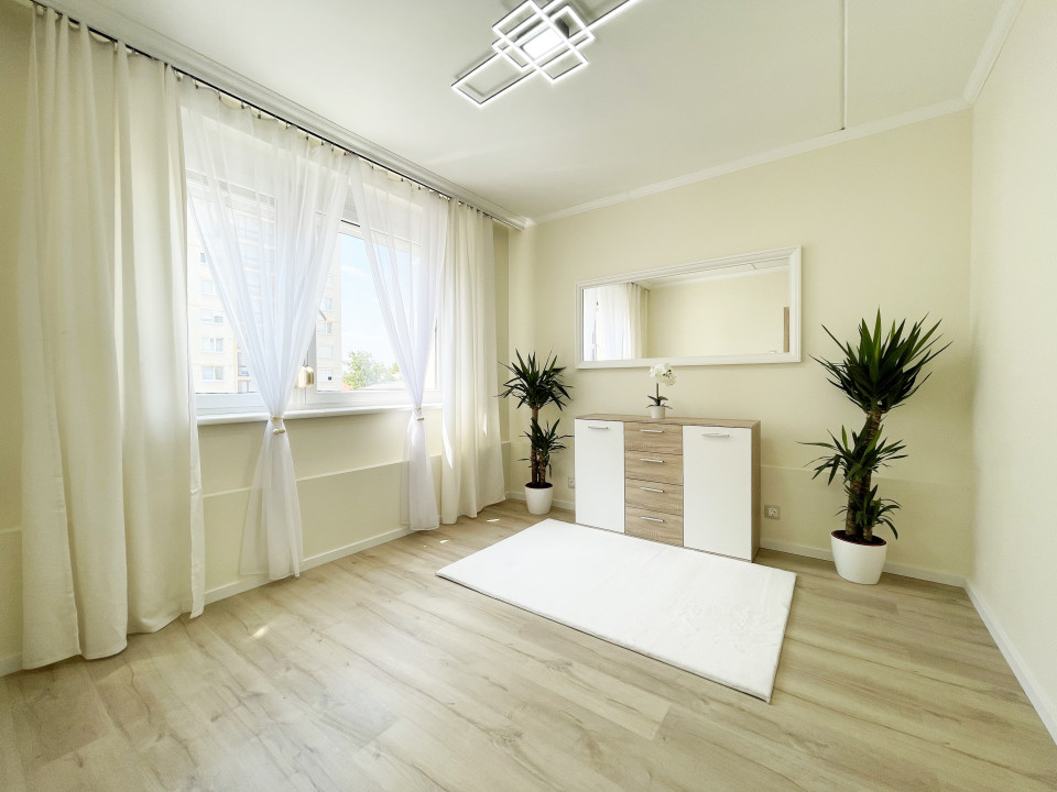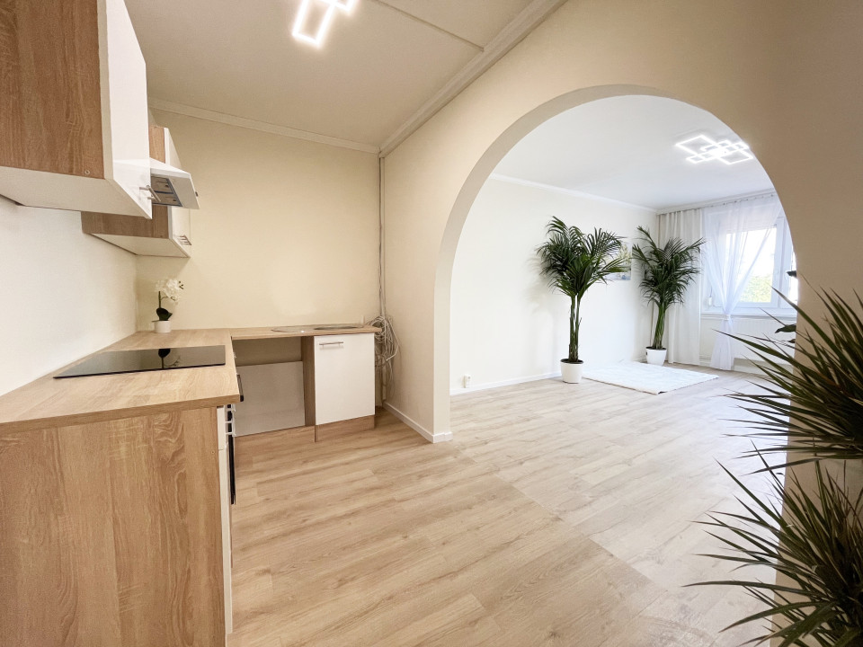 A lakás átalakítása során egy praktikus, modern elrendezés valósult meg. A korábbi konyha helyére külön szoba került kialakításra, míg a konyha a hallba került át, egy légtérben a nappalival, így egy tágas amerikai konyhás nappali jött létre. A nappaliból ezen felül még egy külön szoba leválasztása is megtörtént, így a lakás összesen három külön nyíló, kisebb hálószobával rendelkezik.