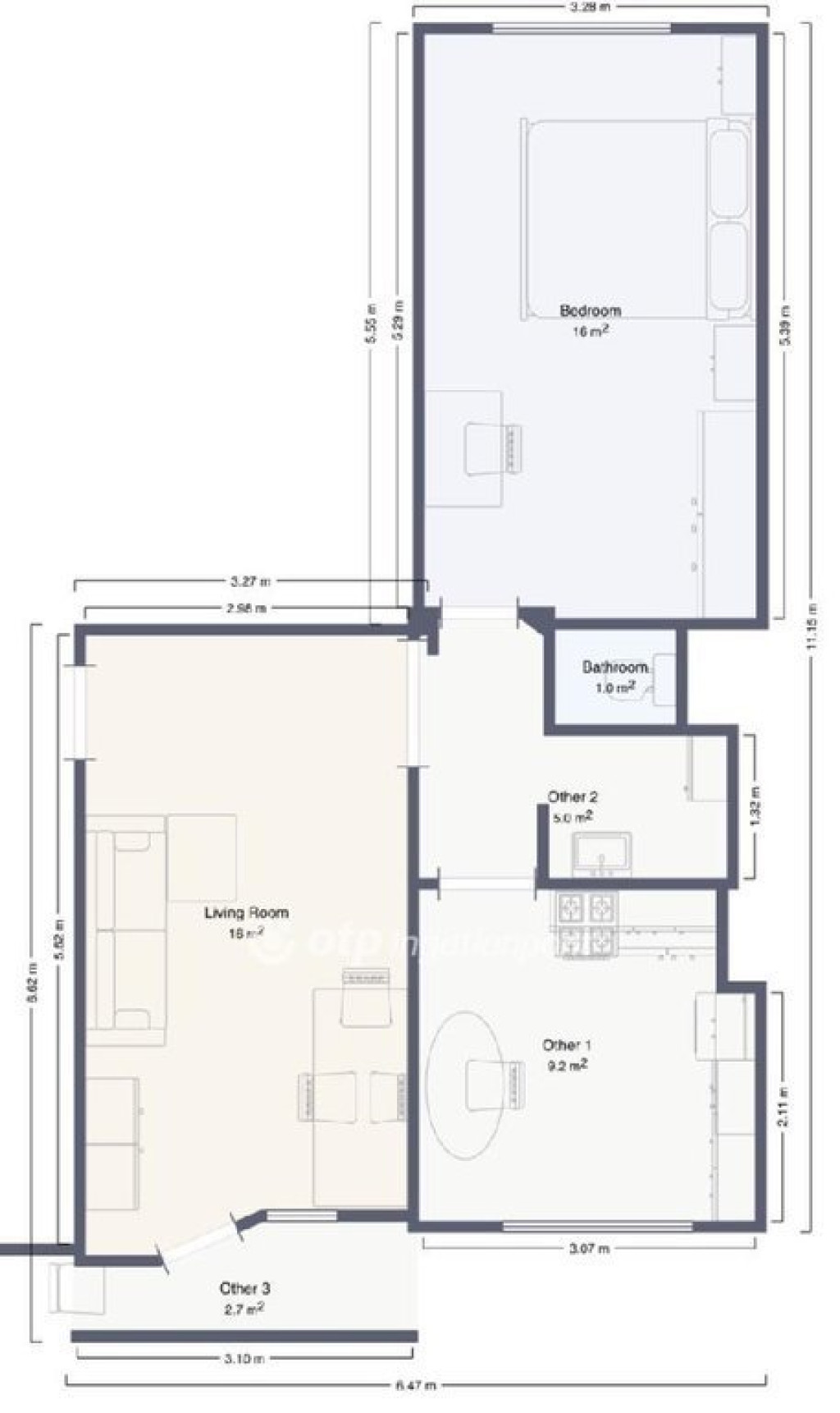 A lakás 2,7 méteres belmagasságú, elosztása praktikus: egy 16 nm-es nappali, egy 16 nm-es szoba, egy 9 nm-es konyha, egy 5 nm-es fürdőszoba és egy külön WC található benne. A nappali déli tájolású, ennek köszönhetően az ingatlan kifejezetten napfényes.