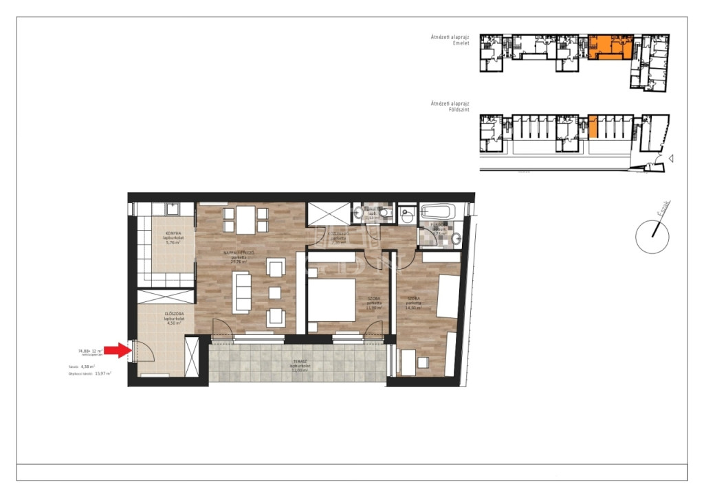 Az ingatlan 74,88 m² hasznos alapterülettel rendelkezik, melyhez egy 12 m²-es, jól használható erkély kapcsolódik. Elrendezése praktikus és keresett: amerikai konyhás nappali + 2 külön nyíló hálószoba, így ideális választás családoknak, illetve bérbeadásra is.