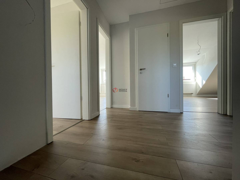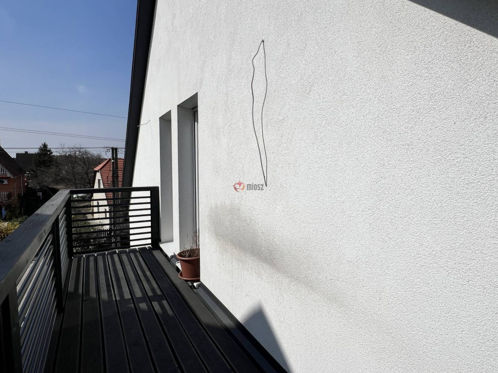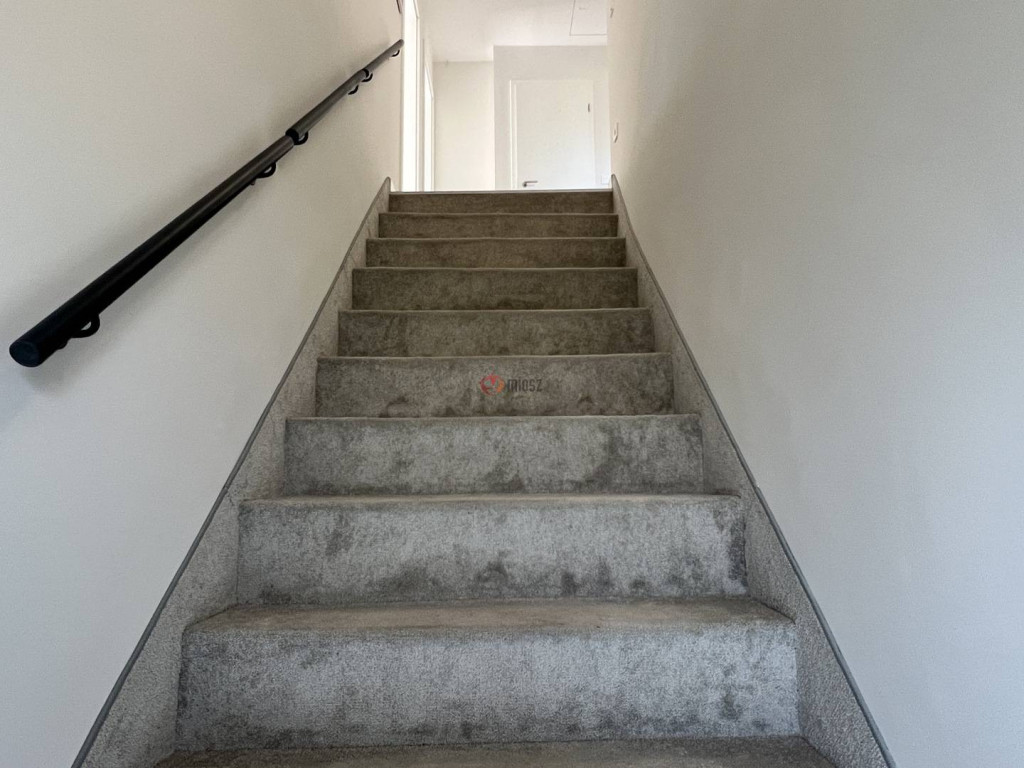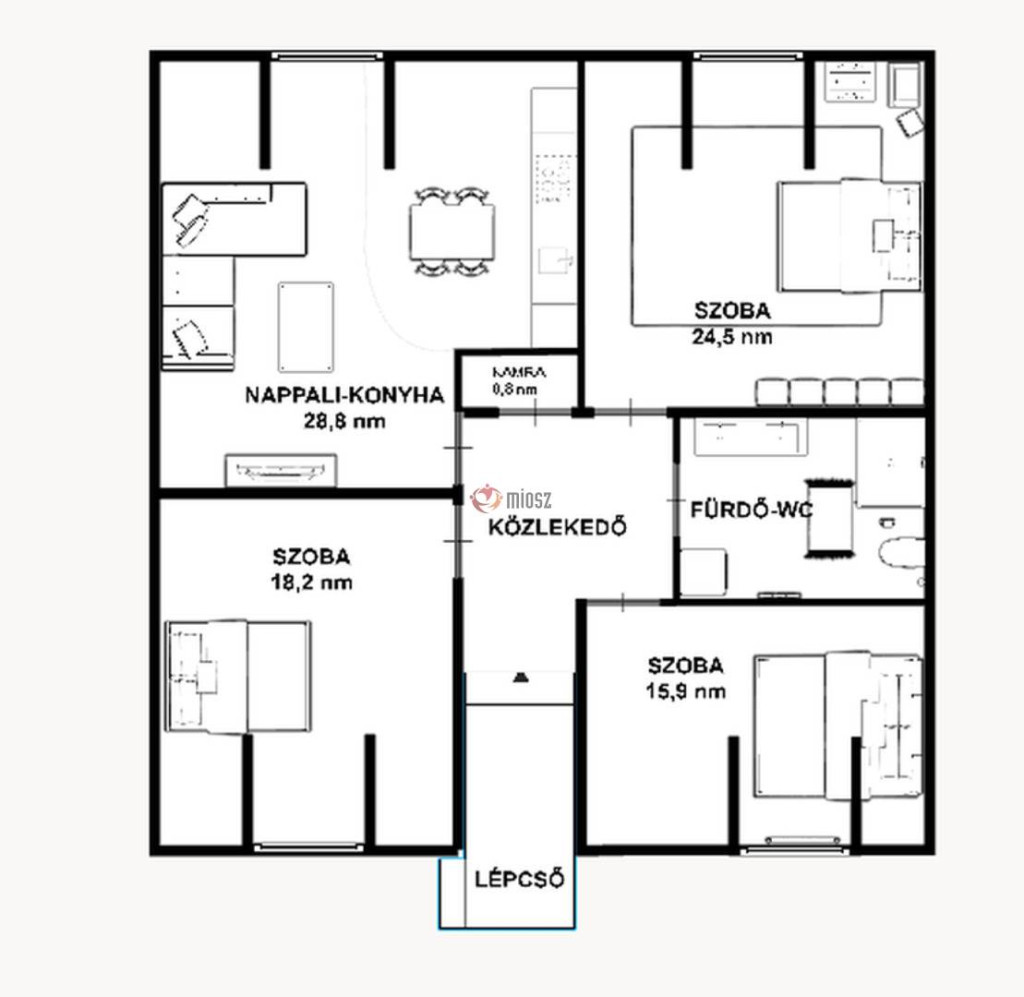 A tetőtéri lakás bejáratához egy külső lépcsőn jutunk fel. Az ingatlan mérete bruttó 104 (nettó 88) m2. Elrendezése amerikai konyhás nappali + 3 hálószoba, fürdőszoba, közlekedő, kamra. A fürdőszoba járólappal, a lakás többi része laminált padlóval burkolt.