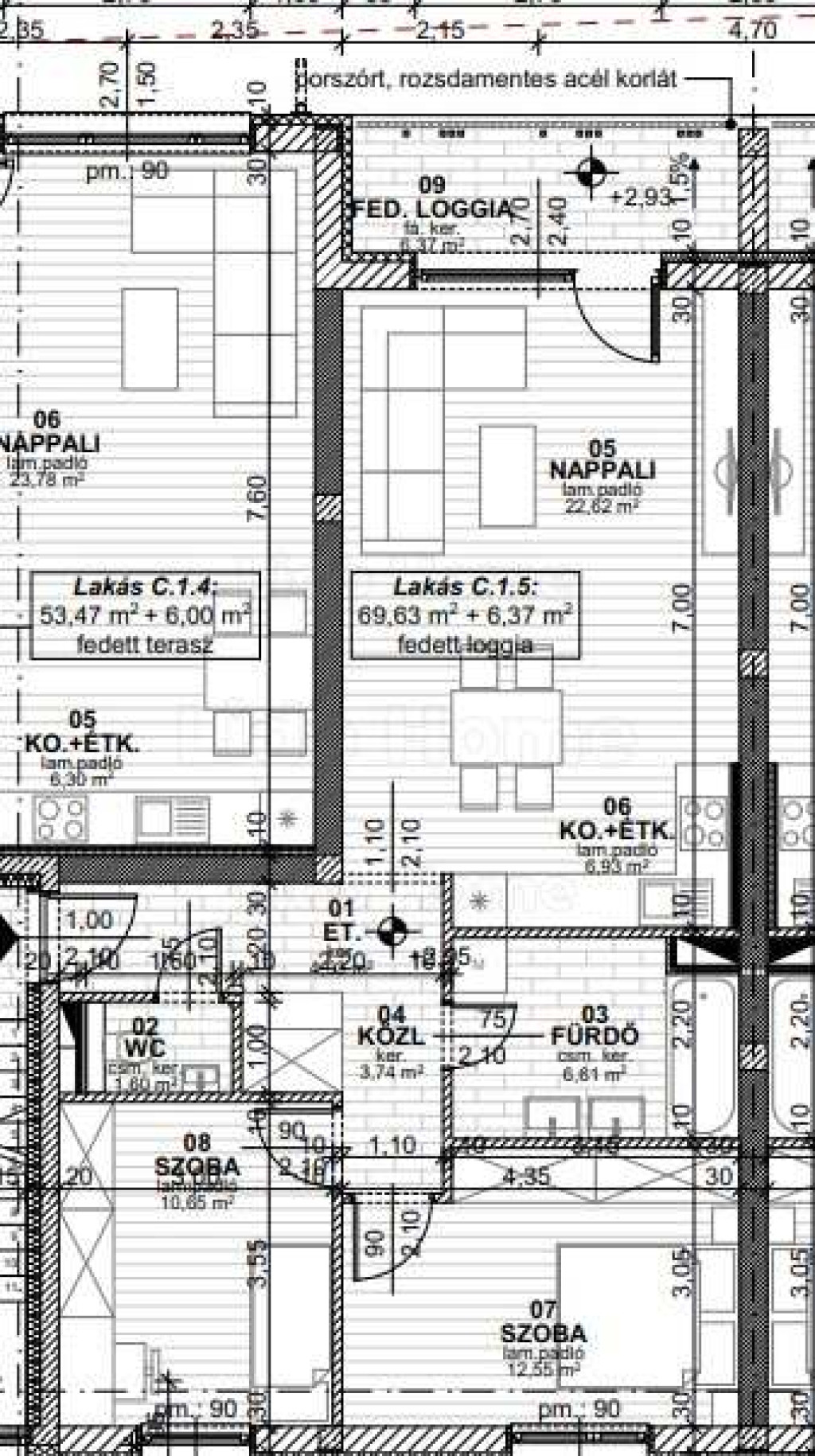 - a lakás 69,63 m2: Előszoba, amerikai konyhás nappali, 2 db hálószoba, fürdőszoba WC-vel