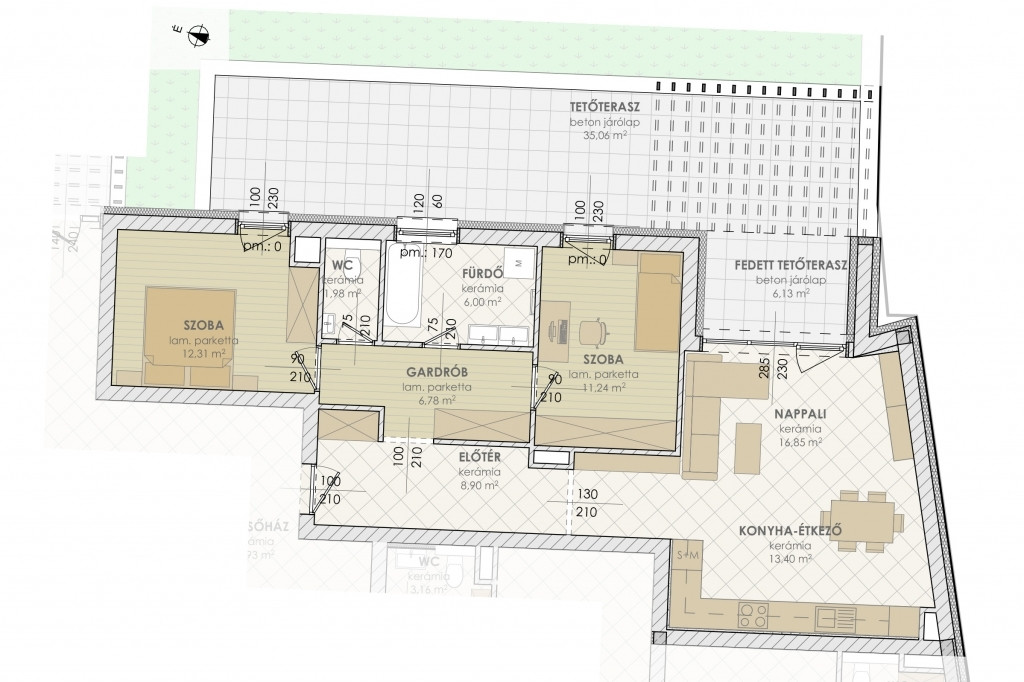Hirdetésben szereplő A11-es lakás nettó 77.46 m2, hozzá tartozó fedett terasz 6.13 m2, terasz 35.06 m2. Nappali-konyha-étkező, két hálószoba, fürdőszoba, WC elosztású.