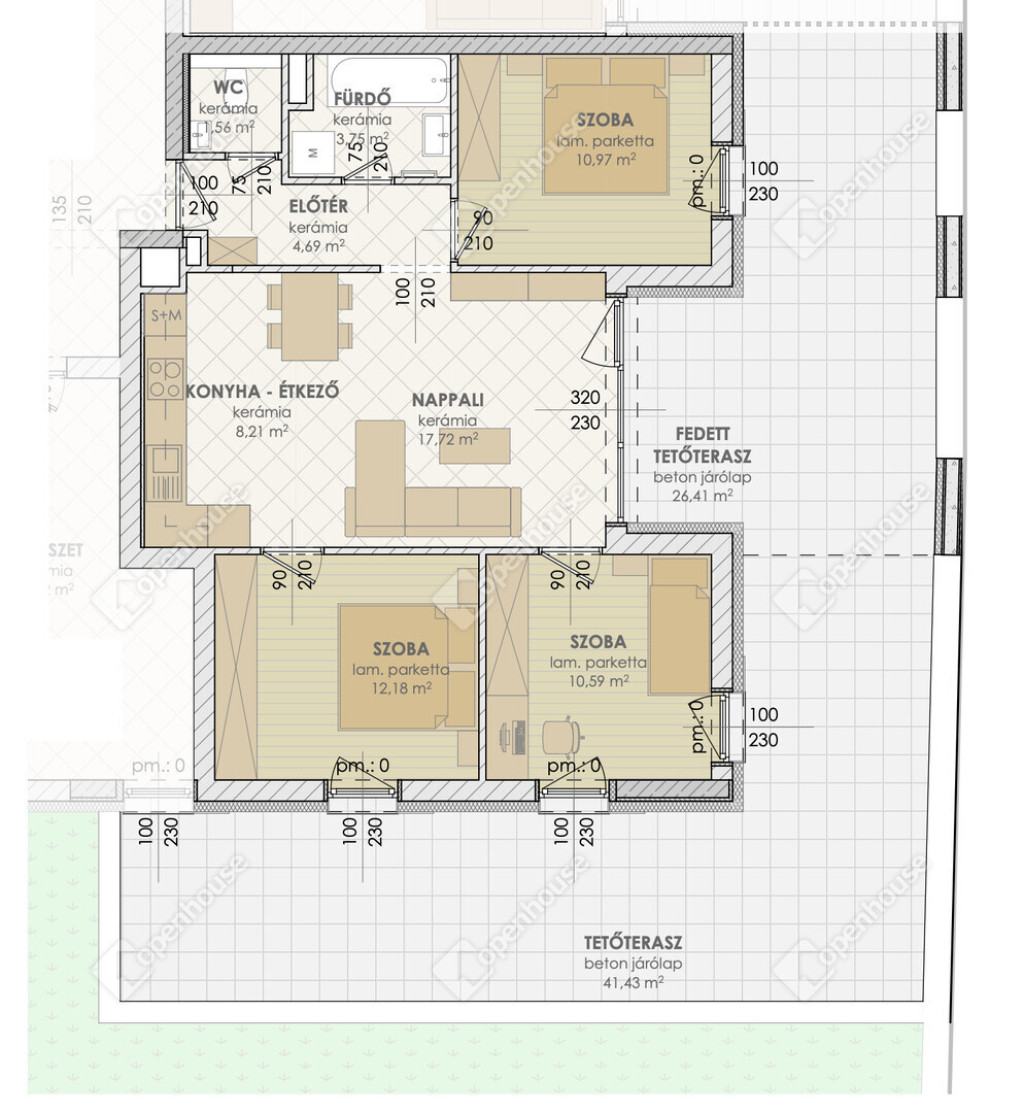 Hirdetésben szereplő B13-as lakás nettó 69.67 m2, hozzá tartozó fedett terasz 26.41 m2 + fedetlen terasz 41.43 m2. Nappali-konyha-étkező, három hálószoba, fürdőszoba, WC elosztású.