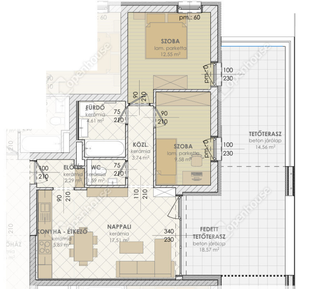 - nettó 57,75 nm lakótér, 18,57 nm fedett terasz+15,56 nm terasz
