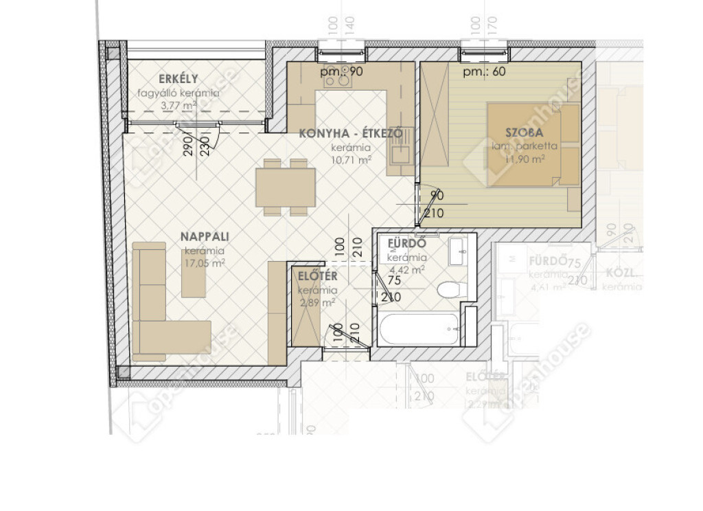 - nappali + 1 hálószoba, konyha-étkező, fürdő elosztású