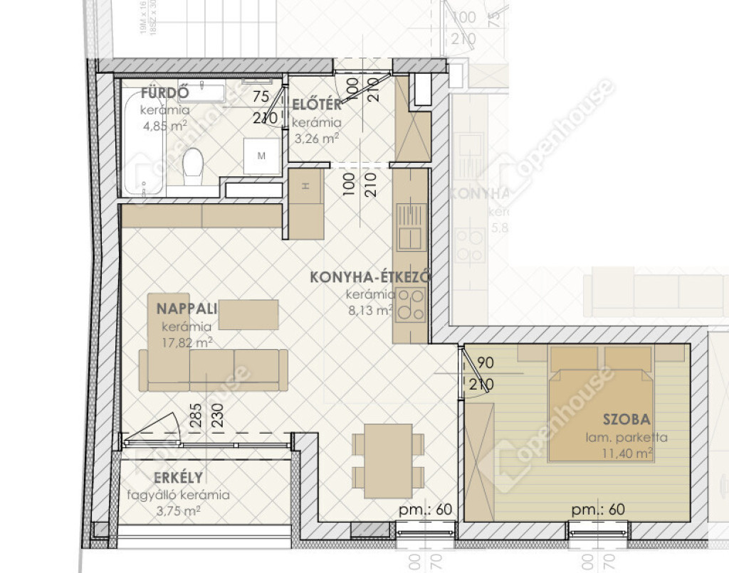 - nettó 45,46 nm lakótér, 3.75 nm erkély