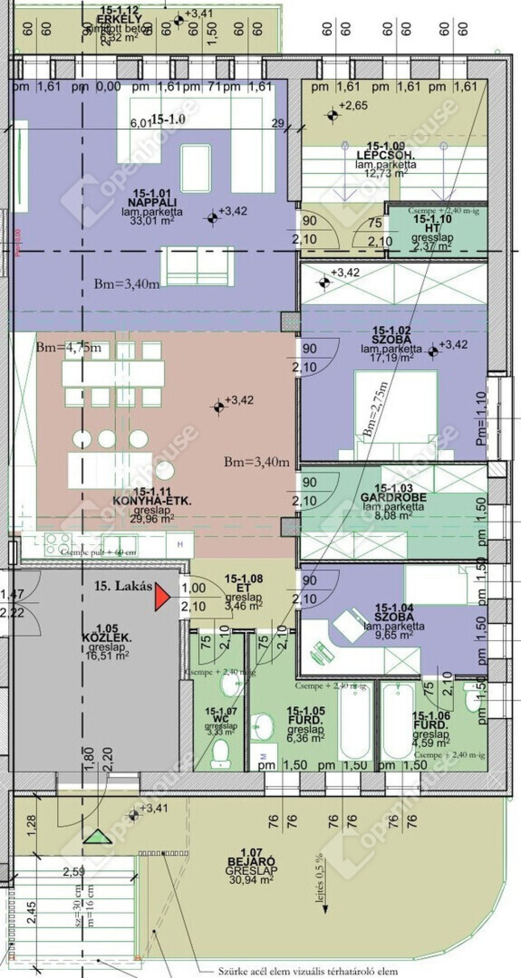 1 em/16 lakás, 130.73 m2, 37 m2 erkély, 35.88 m2 gépkocsitároló.