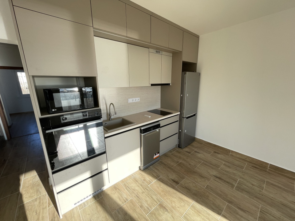 A konyha gépesített (mosogatógéppel, hűtővel elektromos sütővel, indukciós főzőlappal).