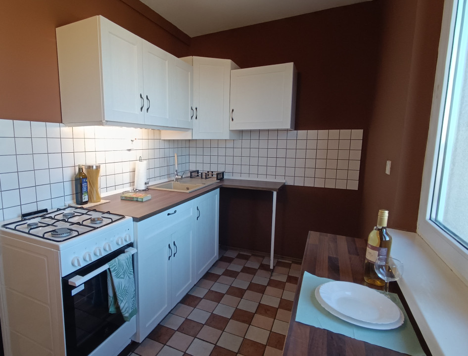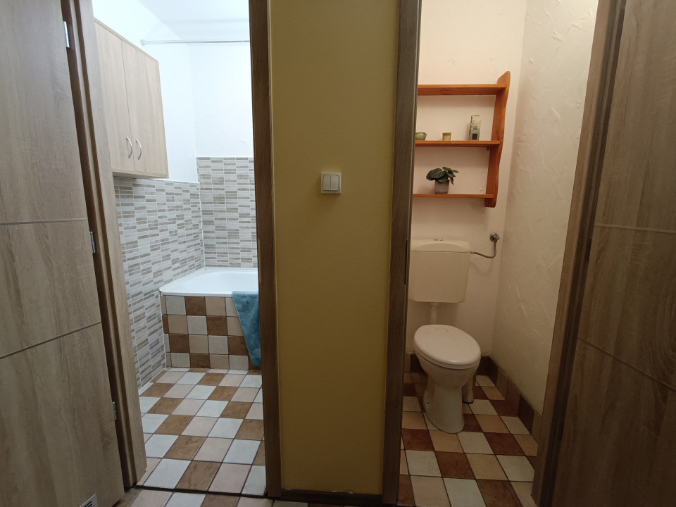 -A fürdőszobában új a bútor, a mosdókagyló és a csap, valamint csőradiátor lett felszerelve. A mosógép kivezetés a konyhába került
