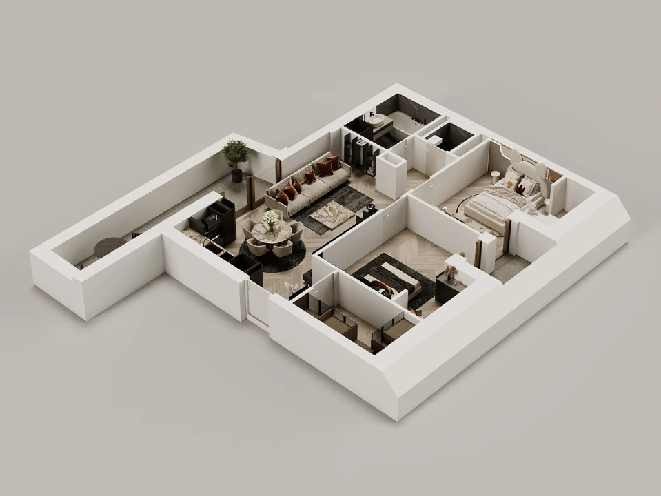 Ebben az elrendezésben két hálószoba kapott helyet, a harmadik szoba nem került ide tervezésre, így a tér kellemesen tágas maradt.