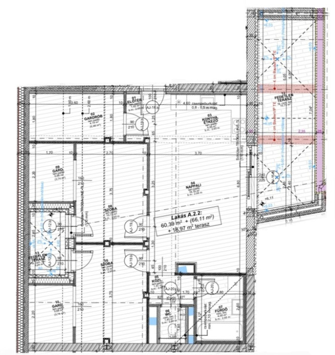 Az A.2.2. lakás méretében valamivel kisebb, de ugyanazt az átgondolt koncepciót és kényelmes elrendezést kínálja, mint a korábban bemutatott lakások.