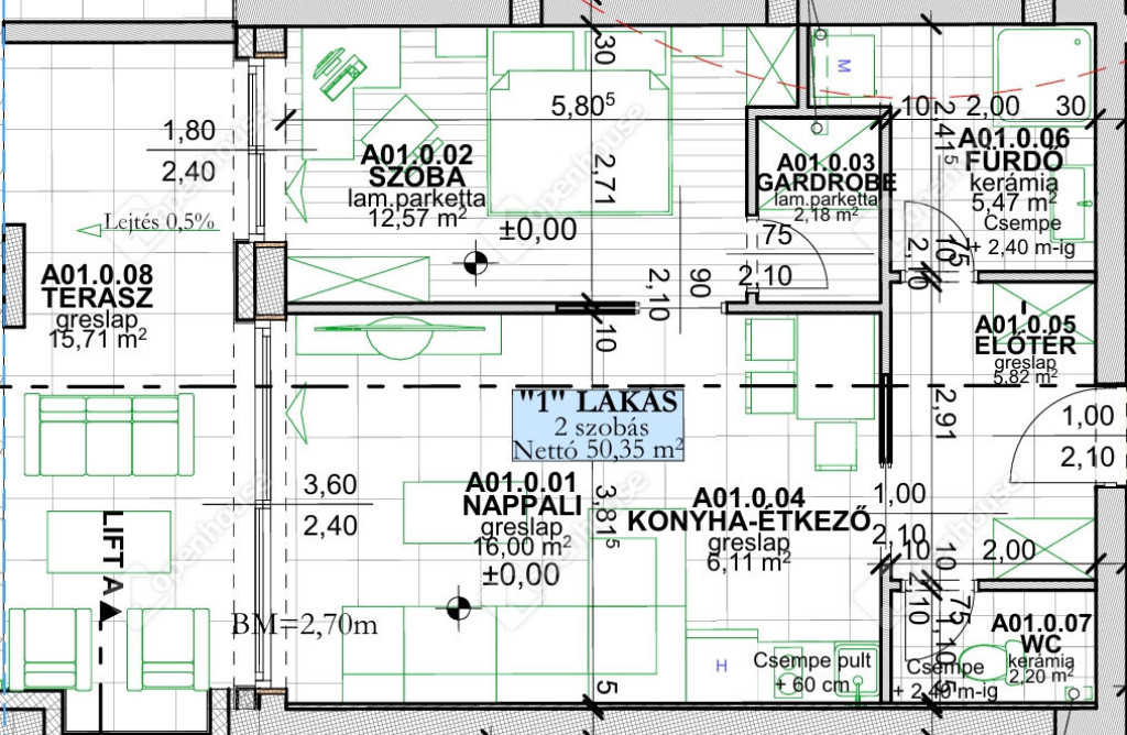 mélygarázsos parkolás, amely biztosítja az udvar nyugalmát és zöld jellegét