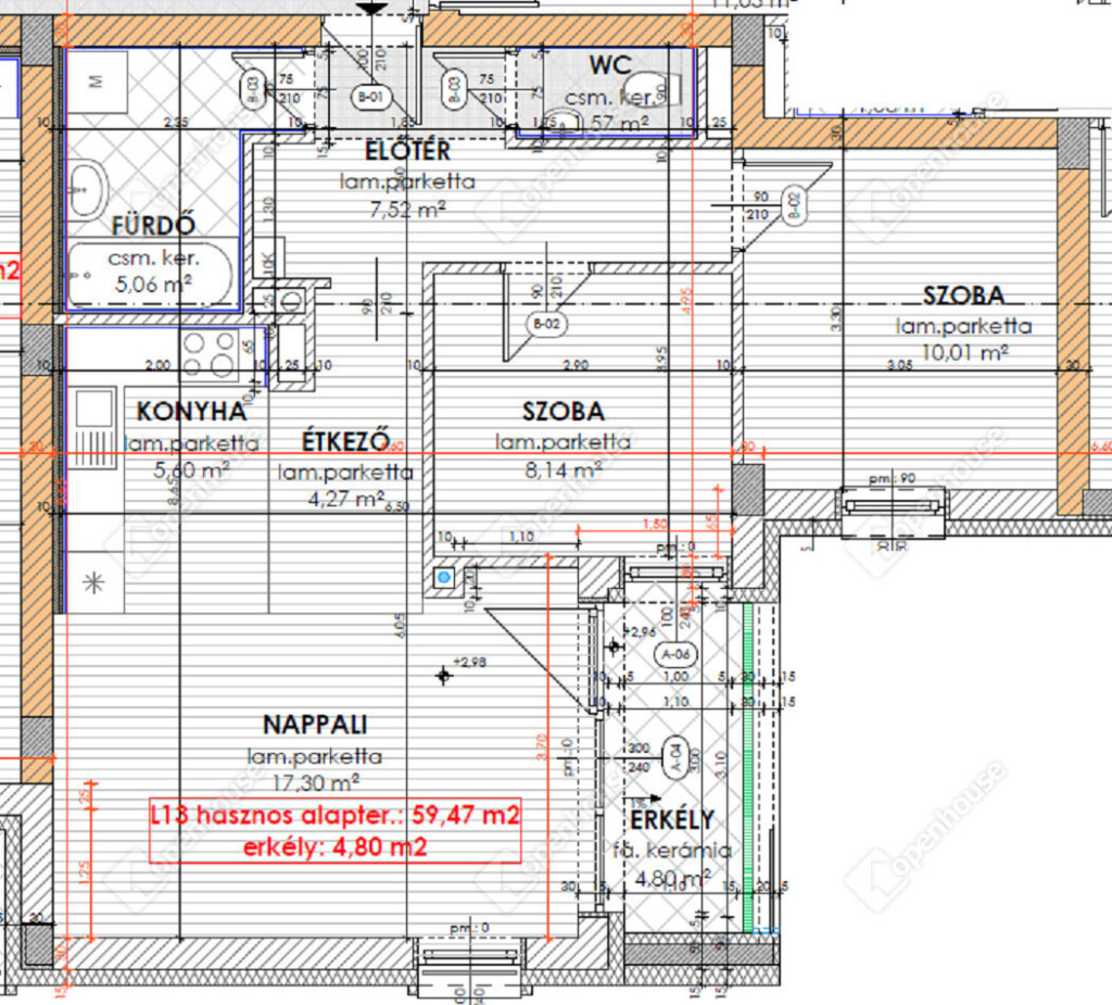 nettó 59,47 m2-es lakás + 4,8 m2-es fedett erkély