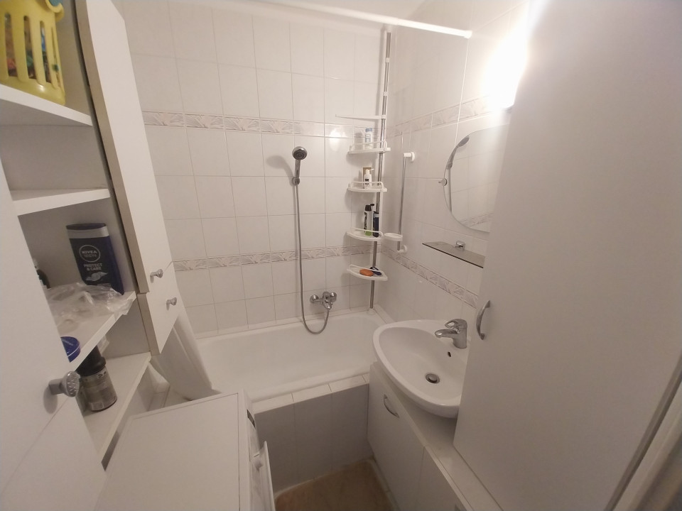 A bejárattal szinte szemben kapott helyet a különálló WC, mellette a fürdőszoba.